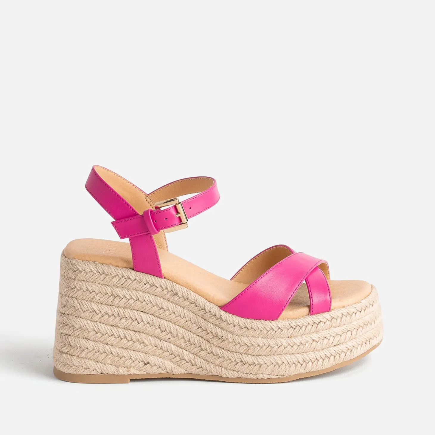 L’invention parfaite pour gagner des centimètres sans risques ? C’est la sandale compensée, avec plateforme. Ici, la semelle de 9 cm à l’arrière et de 4 cm à l’avant est entièrement recouverte de corde naturelle. Dessus, les brides en matière synthétique se déclinent en coloris rose fuchsia avec finition mate. A vous les jolies robes dans les nuances de bleu, de vert ou de rose.