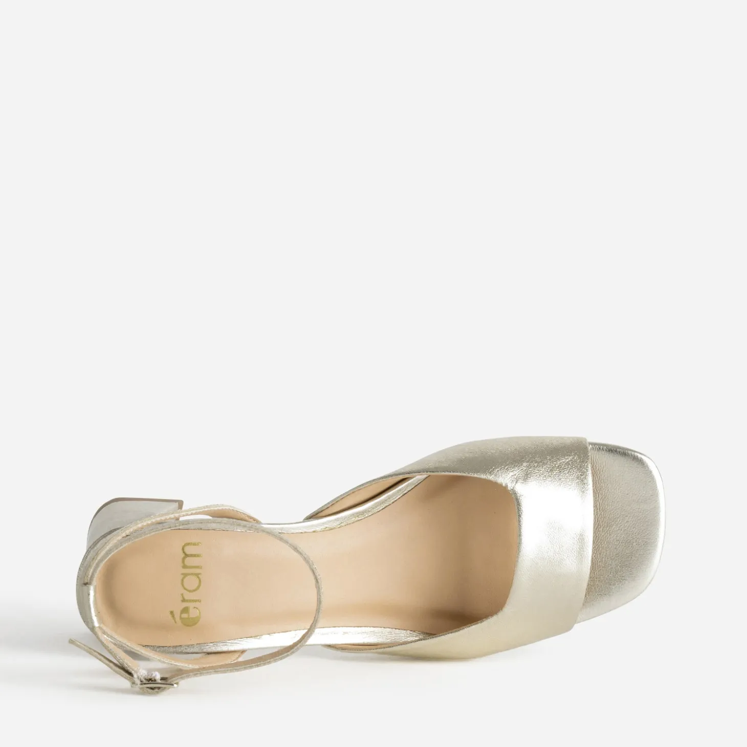 La sandale à talon confirme une silhouette contemporaine et élégante. Confectionnée en cuir métallisé doré, elle se distingue par une large bride à découpe carrée sur le bout du pied, et des brides plus fines pour souligner la cheville. Un modèle complété d’un talon flare de 5,5 cm, idéal avec l’incontournable robe de cérémonie.