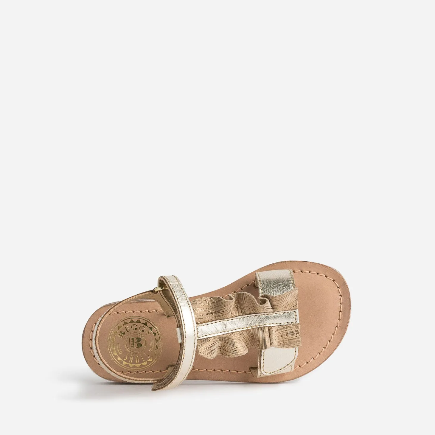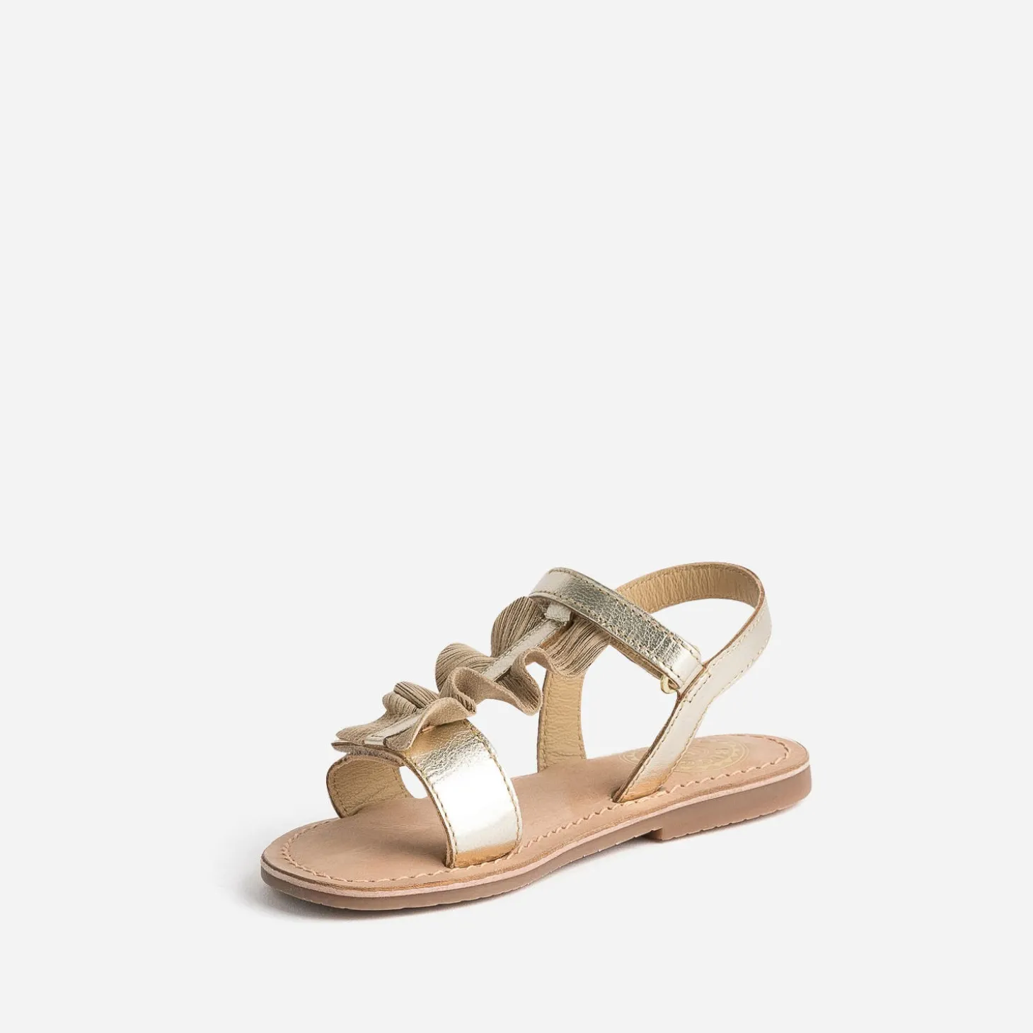Tout en cuir, tout dorée, cette sandale fille ne va pas la quitter de tout l’été. Deux scratchs permettent d’ajuster le maintien du pied, renforcé par une bride en T, décorée d’un volant.