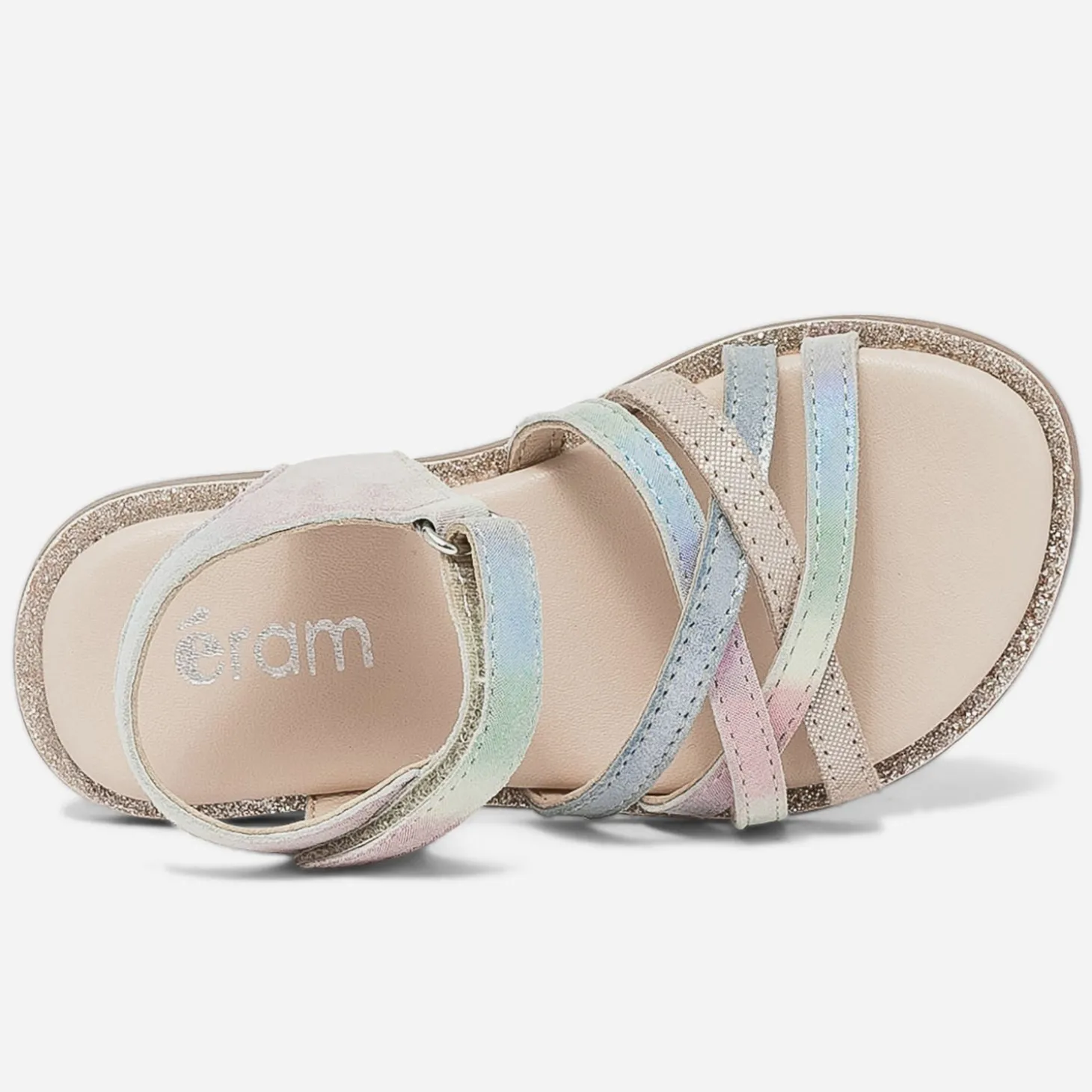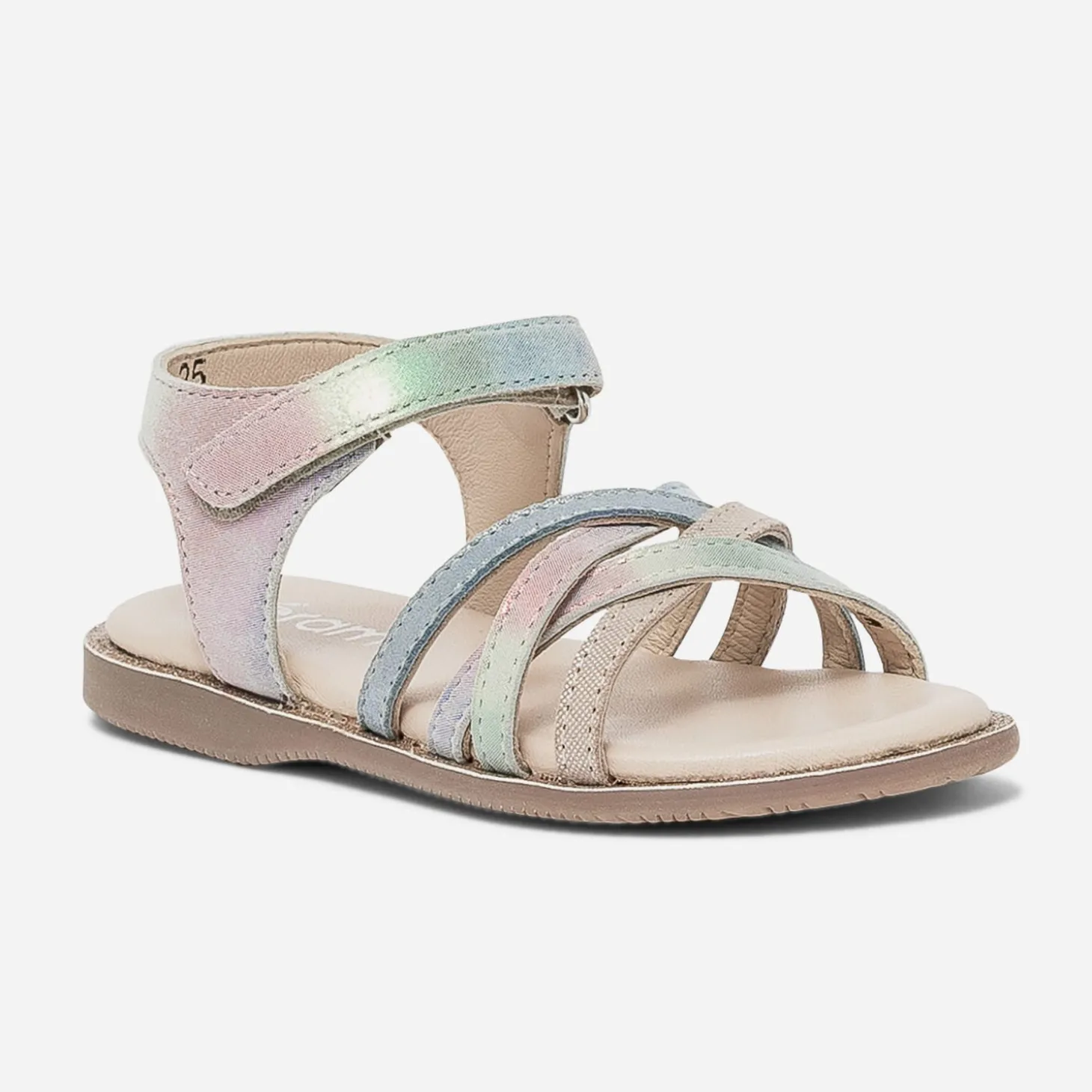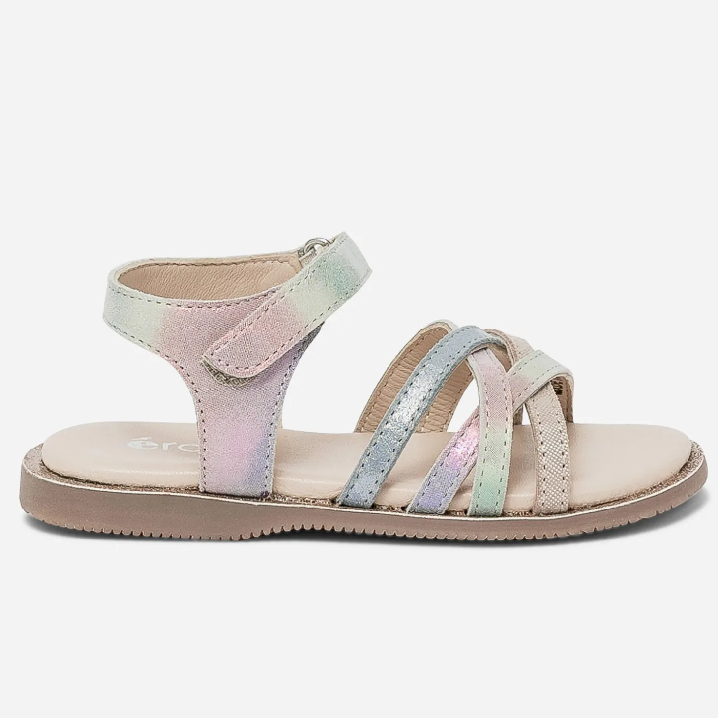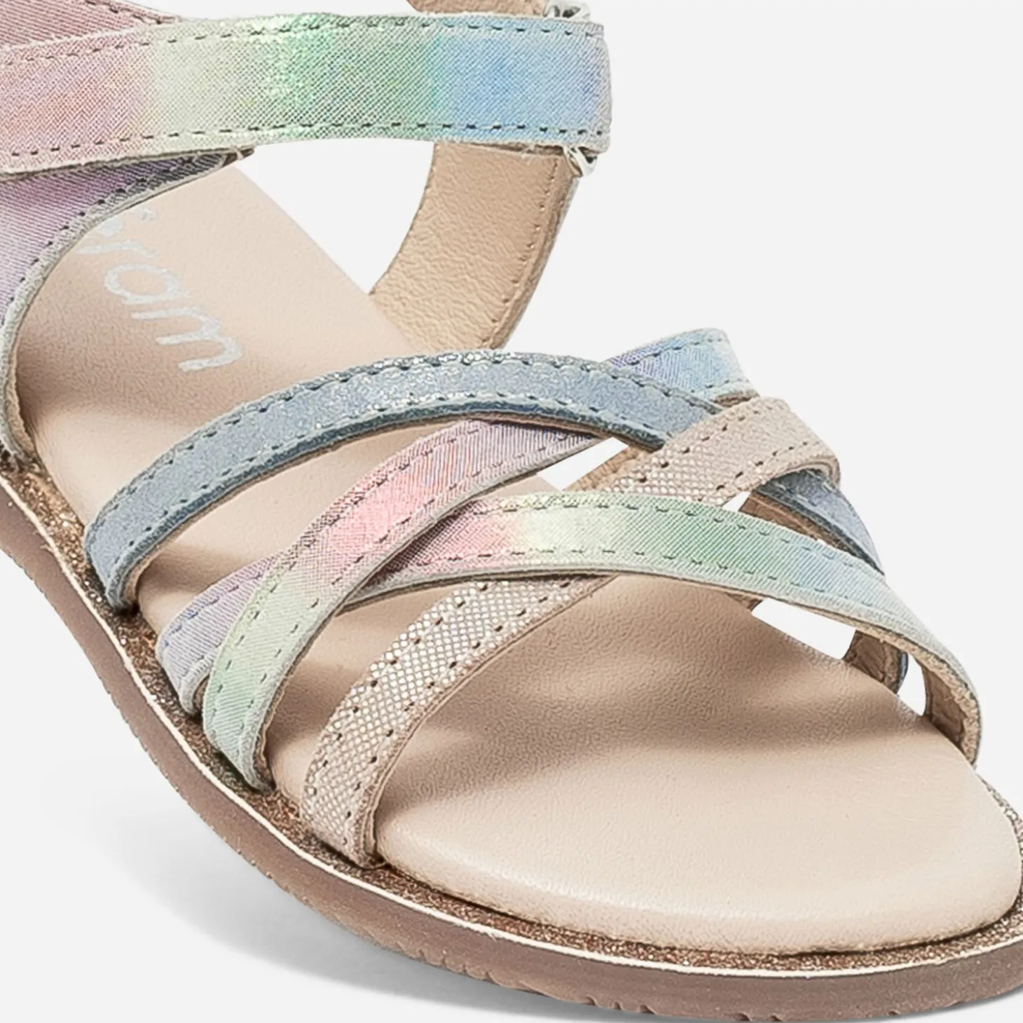 Apporter un peu de magie dans la journée de votre fille, ça n’a pas de prix. Faites le test avec cette sandale. Confectionnée en cuir, elle présente un dégradé de couleurs empruntées à l’arc-en-ciel, doublé d’une finition irisée. La trépointe est, elle, pailletée dorée, comme un bijou précieux. Un modèle à associer avec des pièces en jean bleu et des tons pastel.