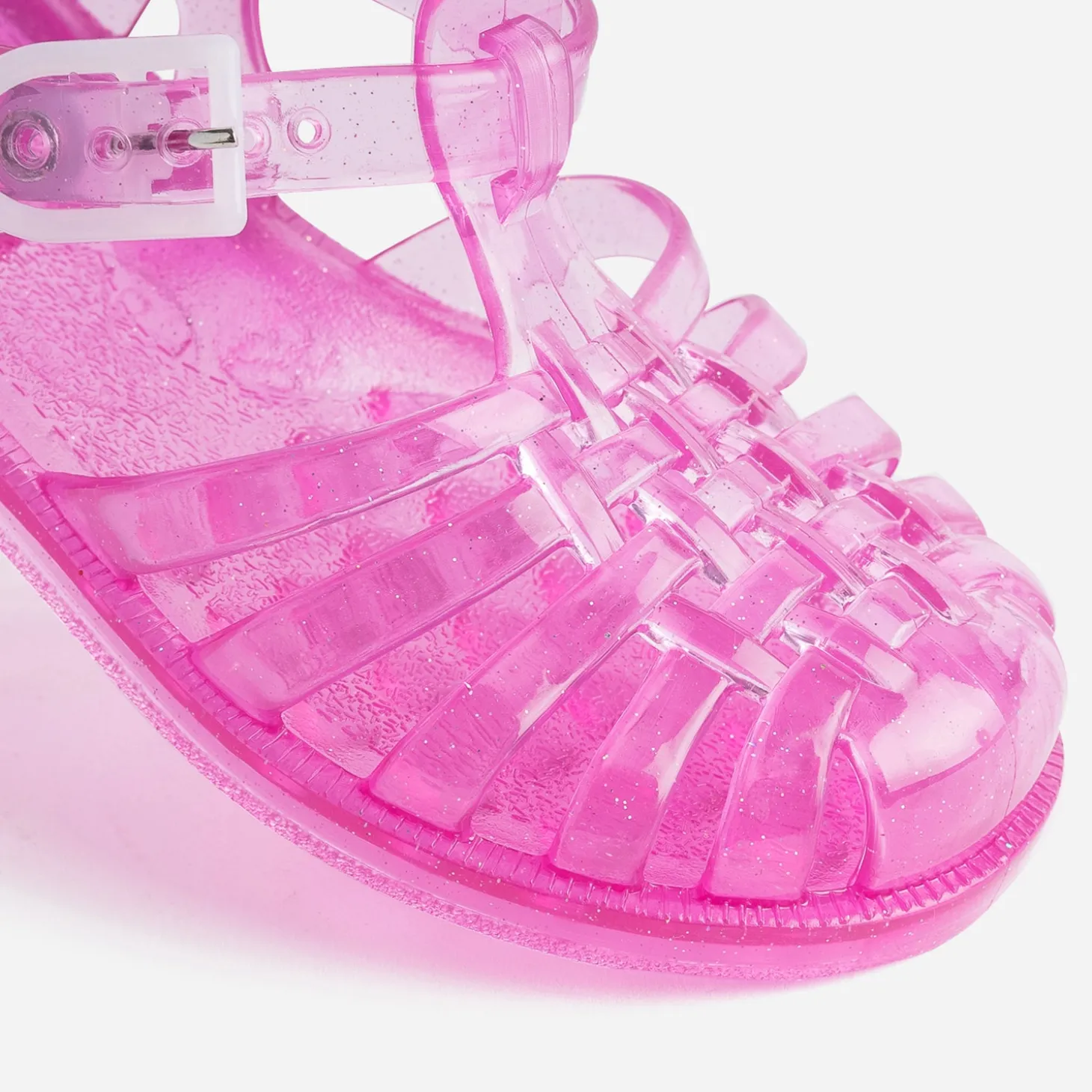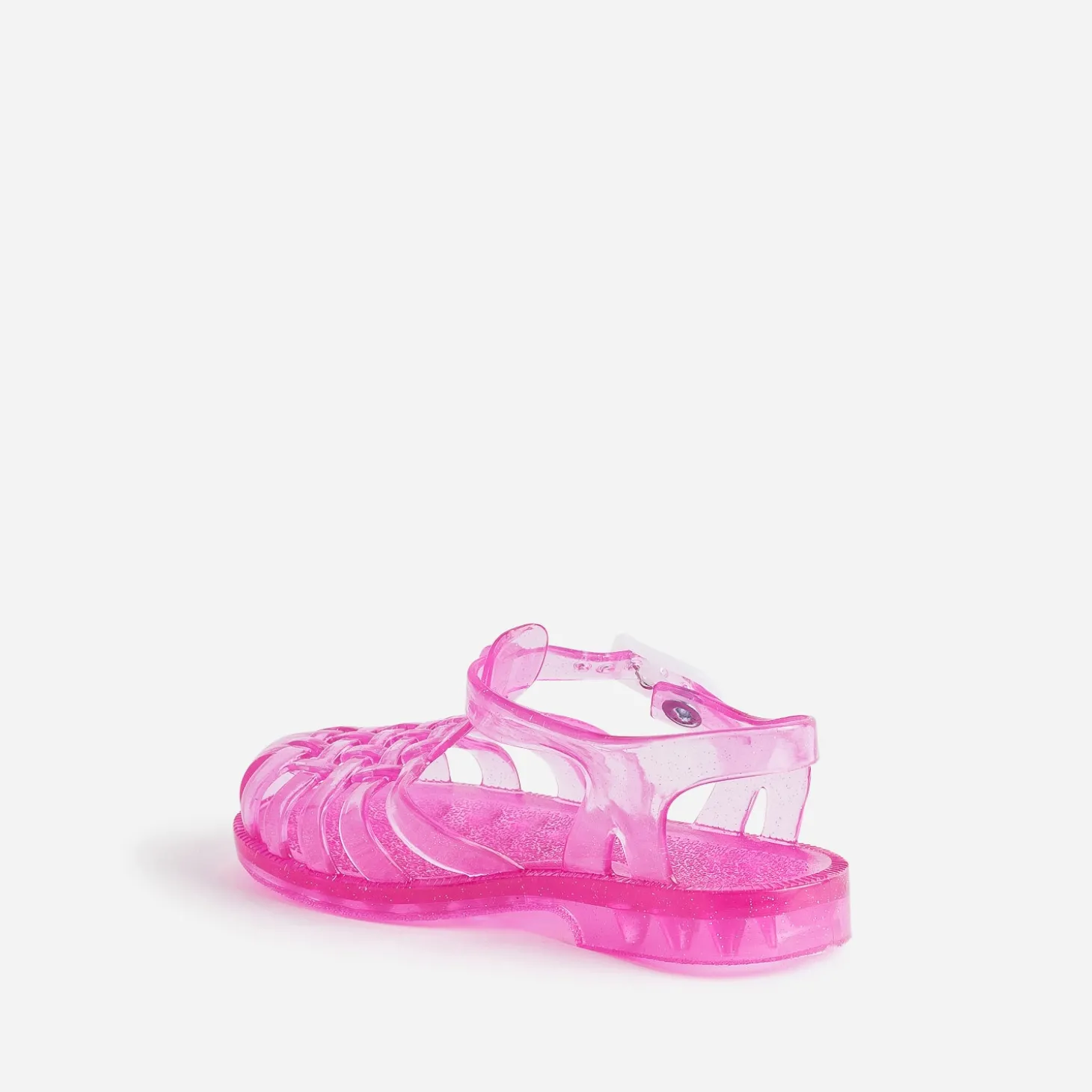 100% fabriquée en France, elle joue l’audace d’un coloris rose délicatement ponctué de paillettes, et se ferme par une bride à boucle. Un modèle enfant qui matche avec toutes les tenues d’été, du bitume jusqu’aux cocotiers !