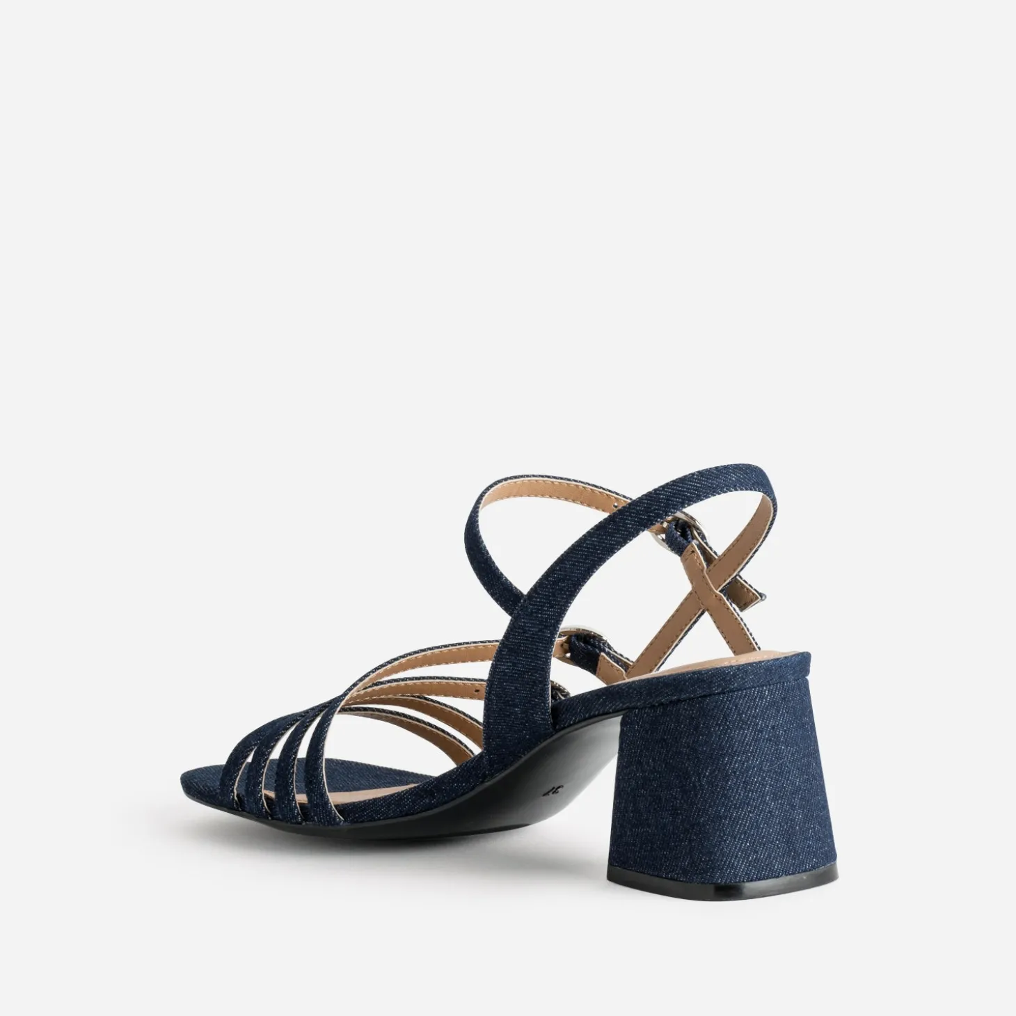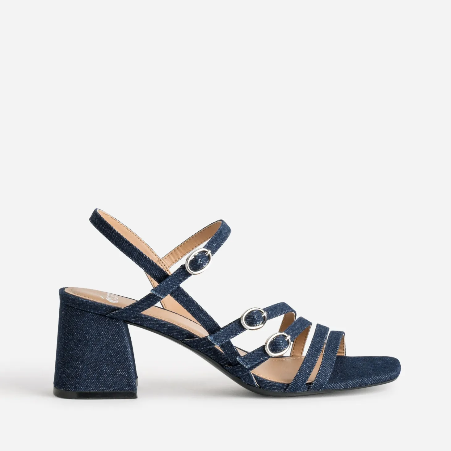 L’iconique toile denim s’empare des accessoires. Ici, c’est la sandale à talon qui reprend les codes du jean brut, sur le bout carré, le talon flare et les brides multiples ajustables. Un modèle à ancrer dans la tendance monochrome, avec un total look denim chemise et pantalon large.