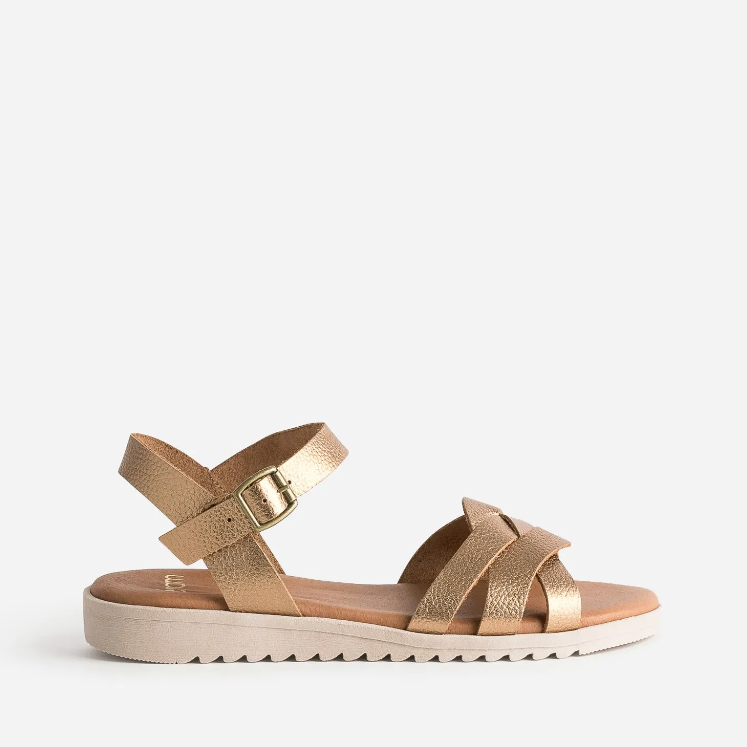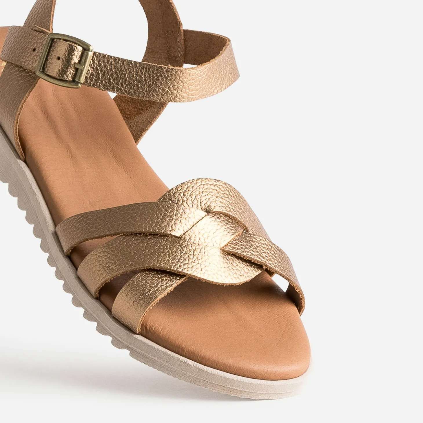 L’idée d’une sandale, qui s’accorde avec tout, est une perspective réjouissante. En cuir marron, avec finition métallisée, celle-ci marque sa singularité par des brides croisées sur le dessus du pied et montées sur une semelle crantée, légèrement compensée. Un modèle idéal, dès l’arrivée des beaux jours, avec des looks plutôt casual.