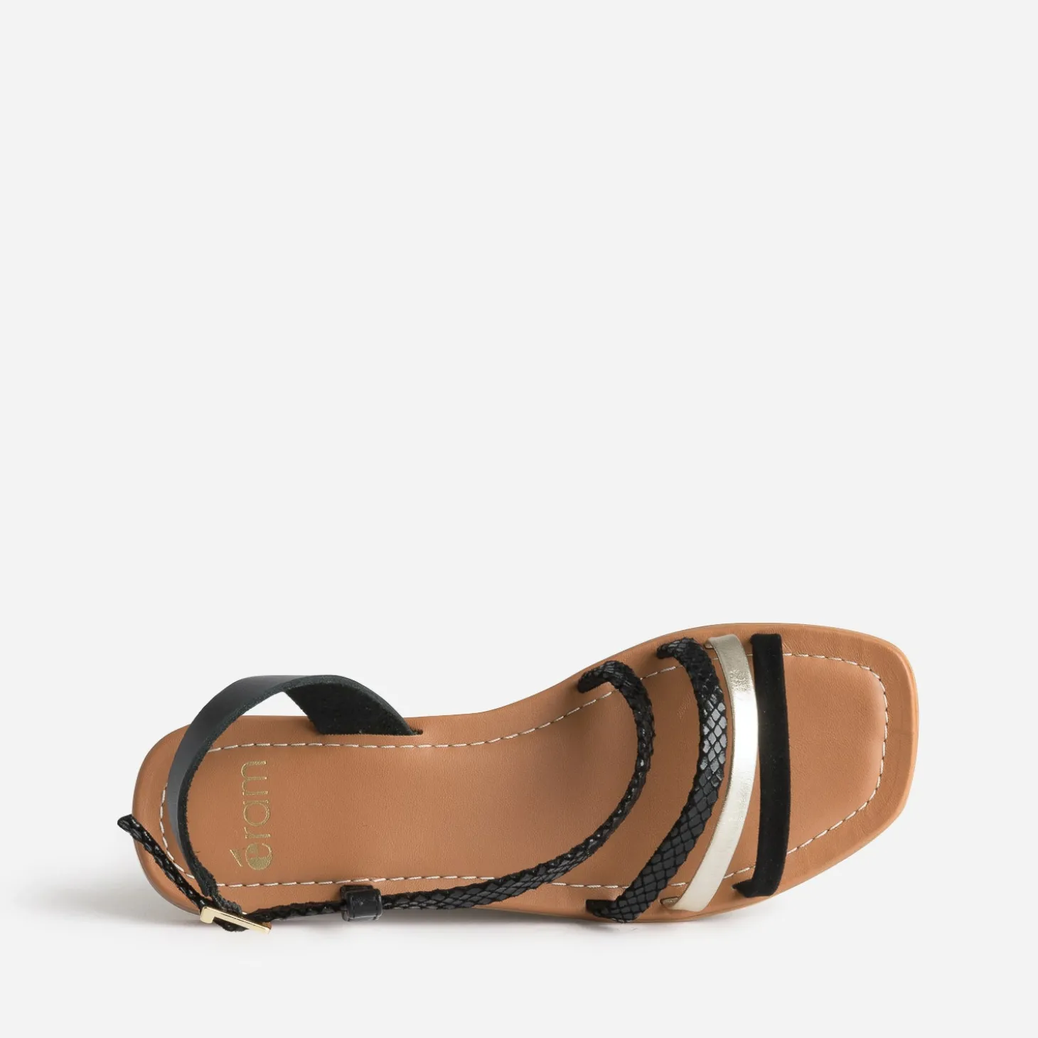 L’association noir et doré et embossage fantaisie pourrait vous surprendre. Elle rythme les fines brides en cuir velours de cette sandale plate pour femme. Combishort kaki, robe longue orangée, costume-bermuda noir, elle donne raison à toutes vos envies mode.