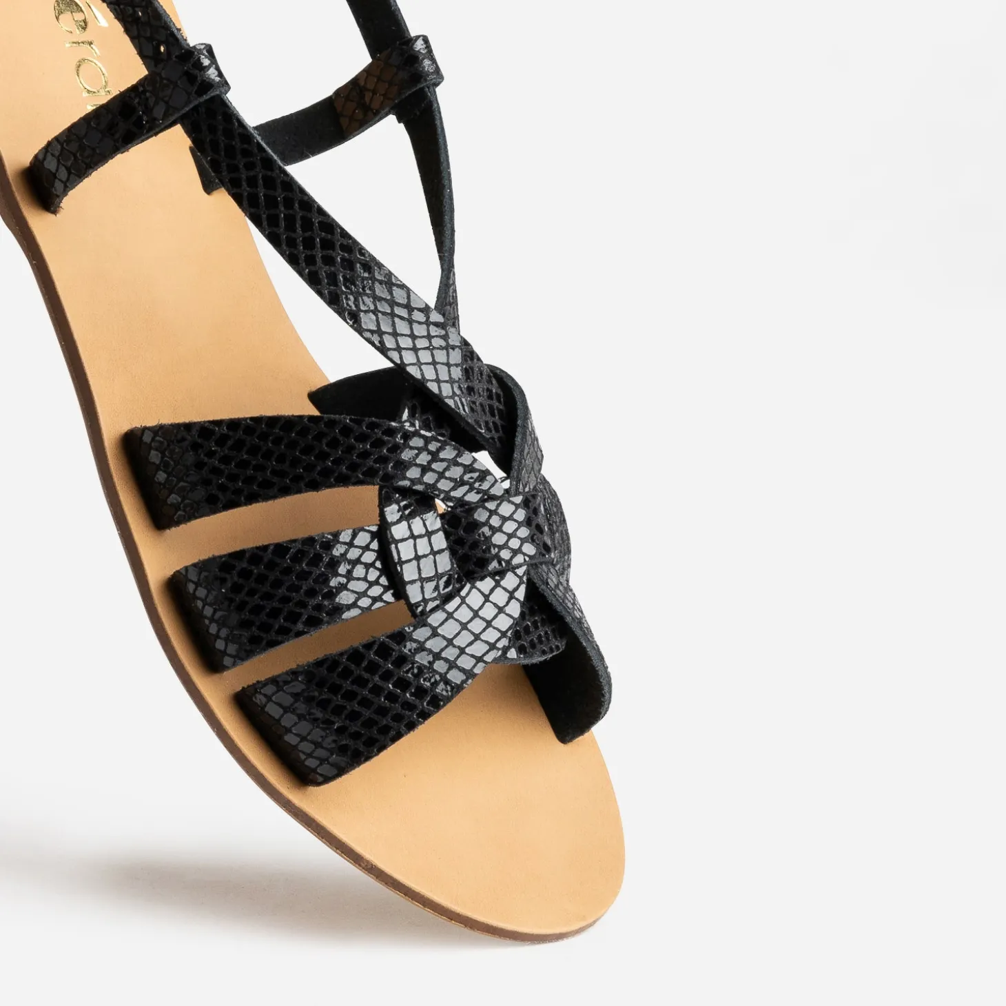 La sandale plate gagne en désirabilité. Les brides, confectionnées en matière synthétique, se croisent avec subtilité sur le dessus du pied et optent pour un coloris noir, avec un effet python verni, très chic. A oser avec une robe longue sublimée par des jeux de drapés.