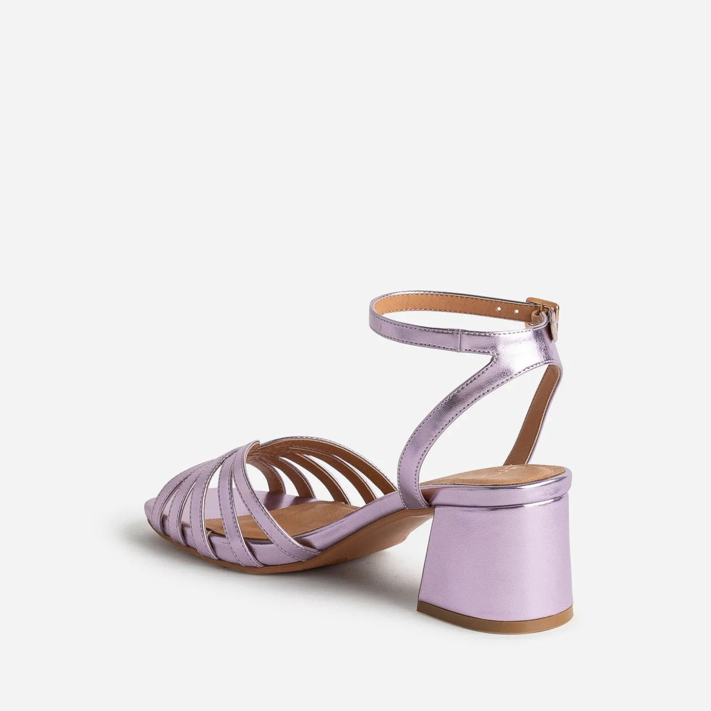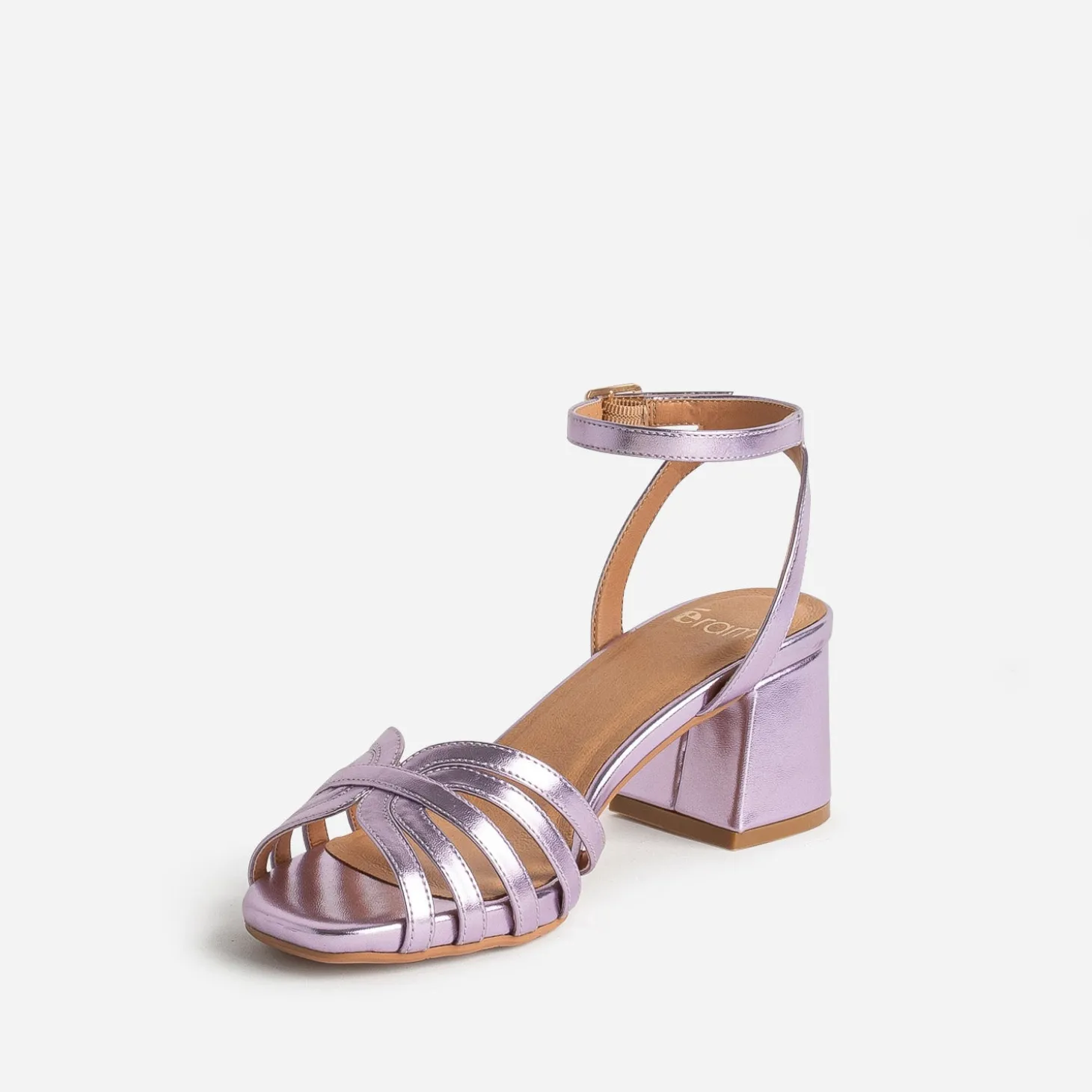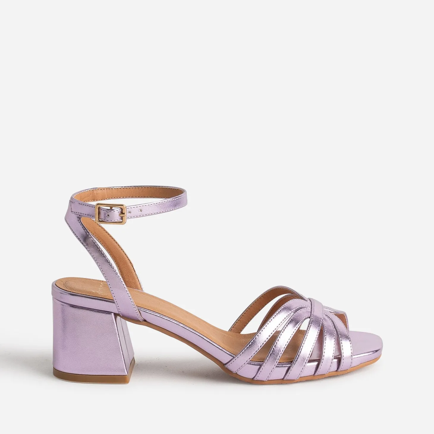 L’enjeu estival qui revient chaque saison ? Trouver des sandales confortables, pour le quotidien comme pour les jours d’exception. En matière synthétique lisse, ce modèle femme ose un sublime coloris parme avec finition métallisée. Les fines brides habillent le dessus du pied et la cheville, le talon adopte une forme flare, esprit rétro, et la semelle première est moussée. Imaginez-la avec une robe longue vaporeuse vert d’eau, ou avec un look monochrome prune.
