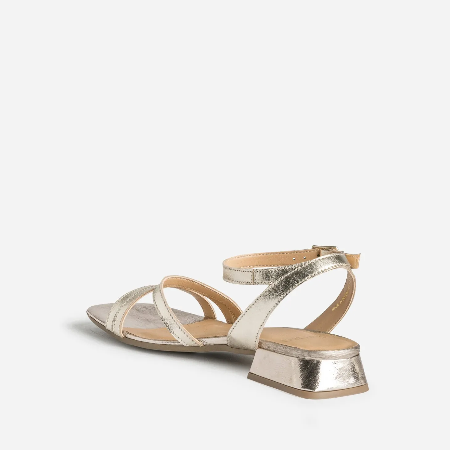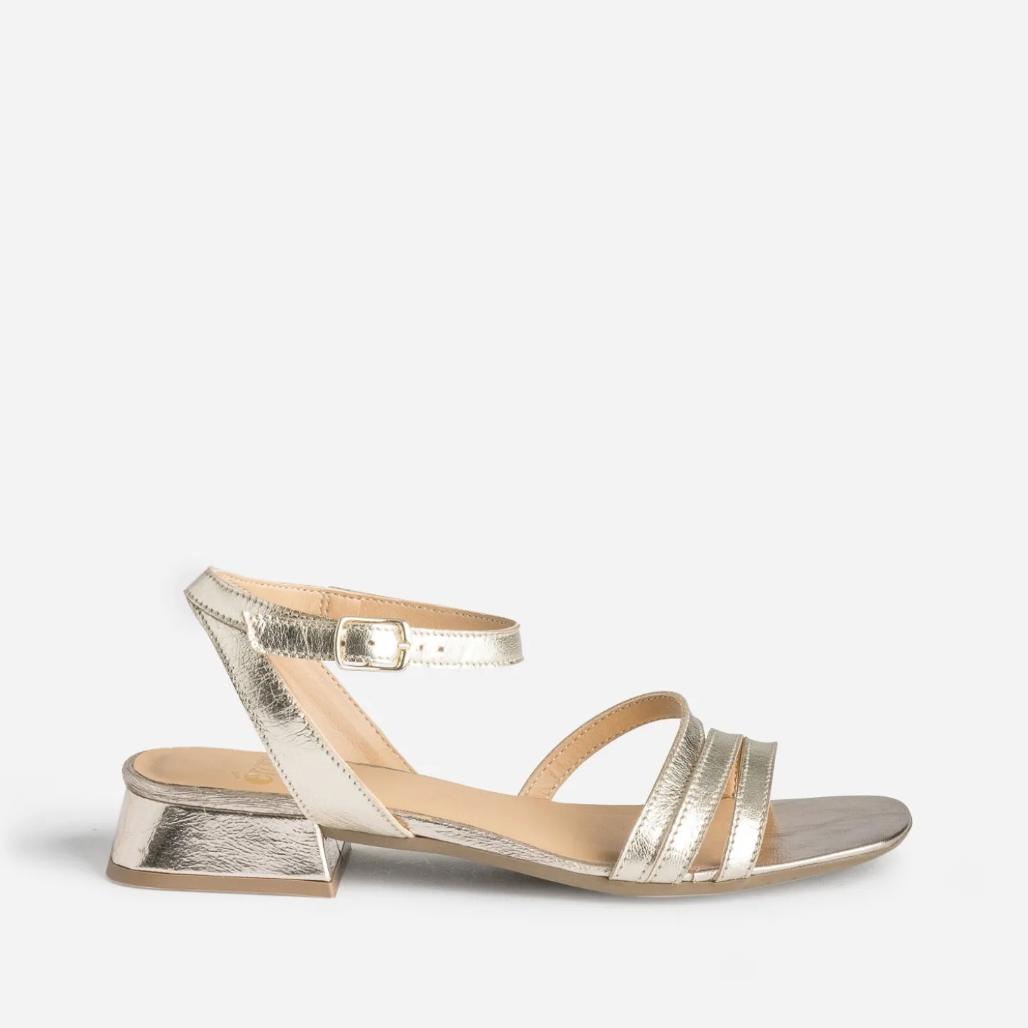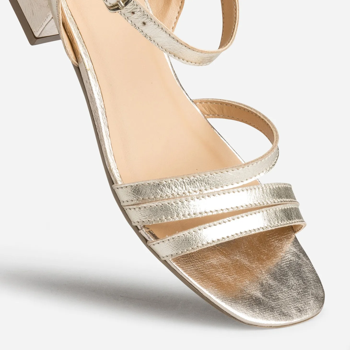 Champagne, platine. Appelez-le comme vous voulez. Cette sandale dorée n’a qu’un seul objectif : faire briller votre été ! Confectionnée en cuir lisse, elle multiplie les brides avec finesse, pour assurer un parfait maintien du pied. Son petit talon adopte une forme flare, pour gagner en modernité. C’est votre caution chic de la saison, avec une robe longue pour une grande occasion, comme avec un look plus formel, tout au long de la saison.