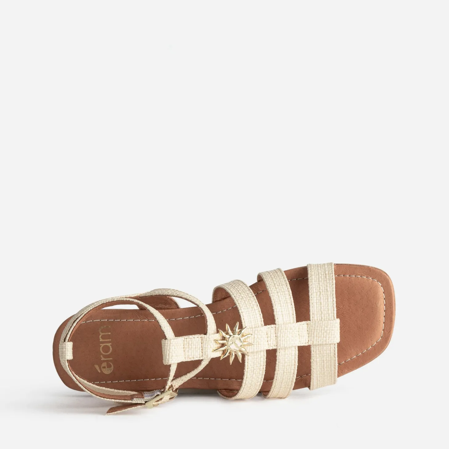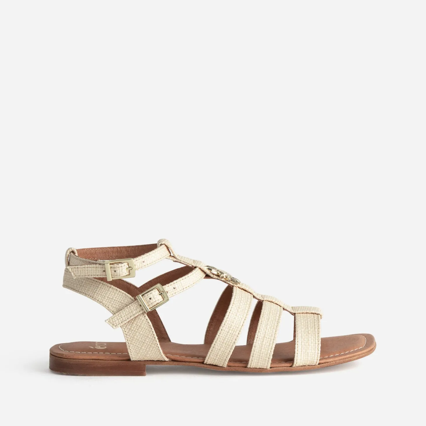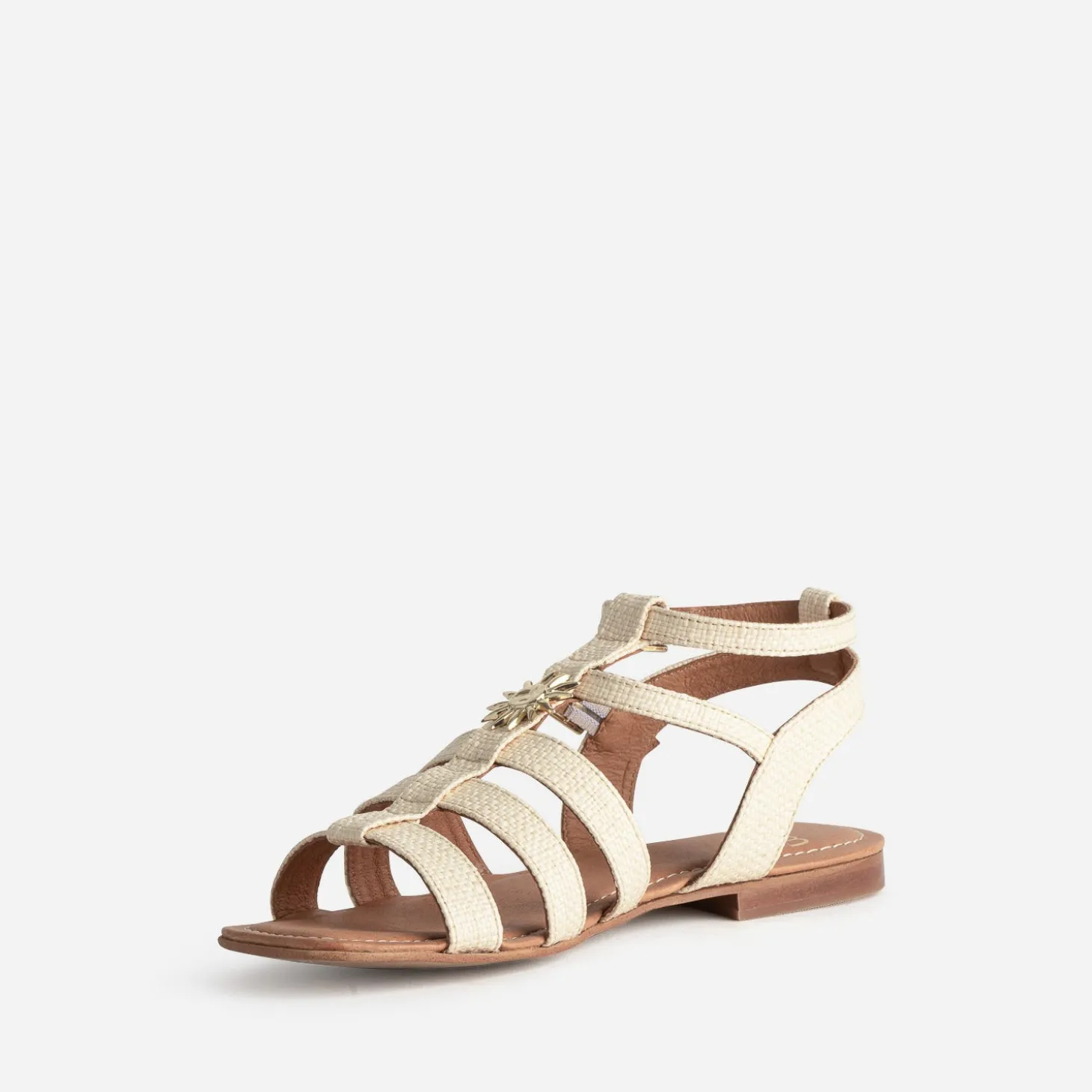 Laissez le soleil guider vos pas avec cette sandale femme inspirée de la spartiate. Son design évoque l’artisanat délicat d’un tressage beige naturel, tandis que le décor soleil en métal jaune apporte une touche de lumière et d’évasion à vos journées estivales. Un modèle plat confortable, pour flâner au gré de vos envies, en robe longue bohème, capeline sur la tête et panier en guise de sac à main.