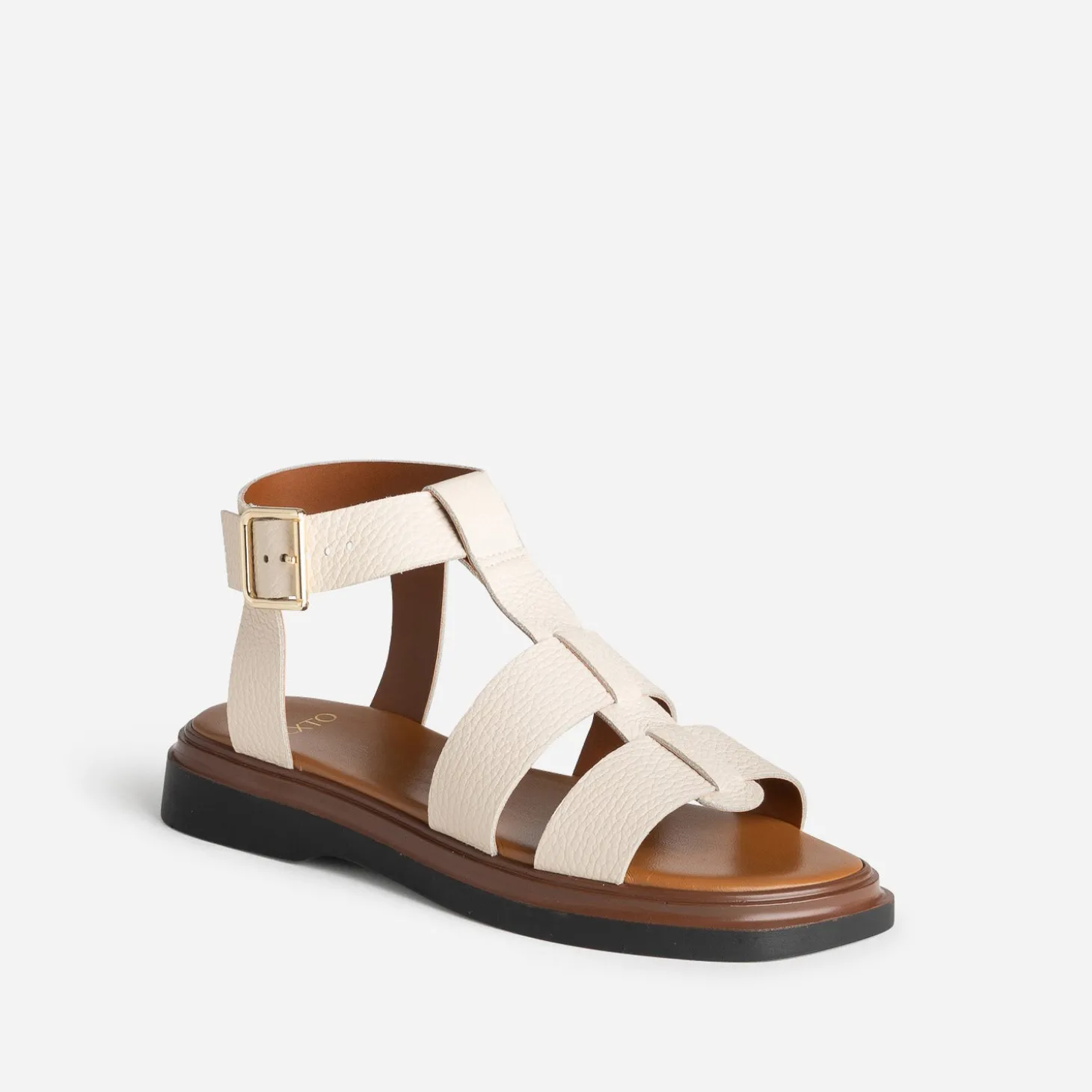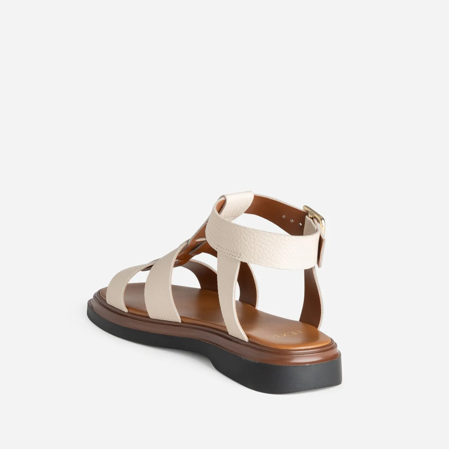 L’héritage grec se réinvente avec cette sandale pour femme. Les larges brides en cuir évoquent les spartiates d’origine, tandis que la semelle plate et légèrement compensée s’adapte aux tendances estivales. Déclinée en coloris écru, elle décore la cheville d’une boucle carrée en métal jaune. Un modèle qui ne cache pas son élégance, avec un débardeur écru, un pantalon large en lin kaki et un long sautoir en guise de bijou.