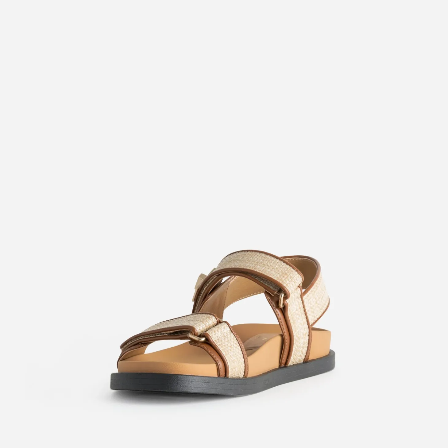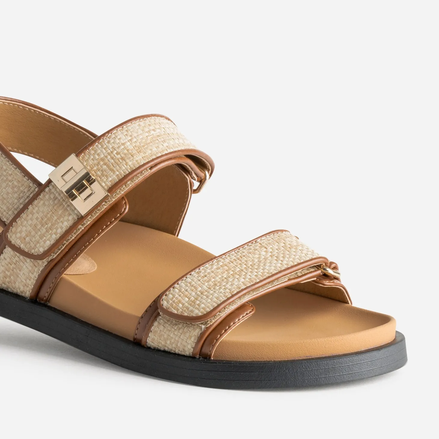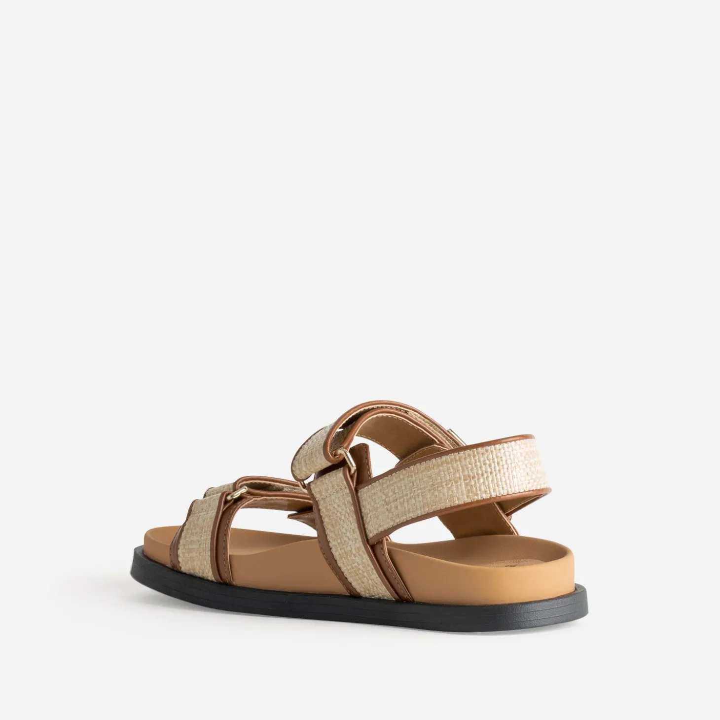 Ne lésinez pas sur le confort, même, et surtout, en été. Cette sandale, d’inspiration Dad Sandals, l’a bien compris : elle offre un maintien parfait, grâce à trois larges brides, dont deux fermées par scratch, s’ajustant au mieux sur le pied. Un tourniquet décoratif en métal doré est placé sur le côté. Choisissez-la en coloris beige sur effet raphia, parfait pour finaliser des looks ultra minimalistes.