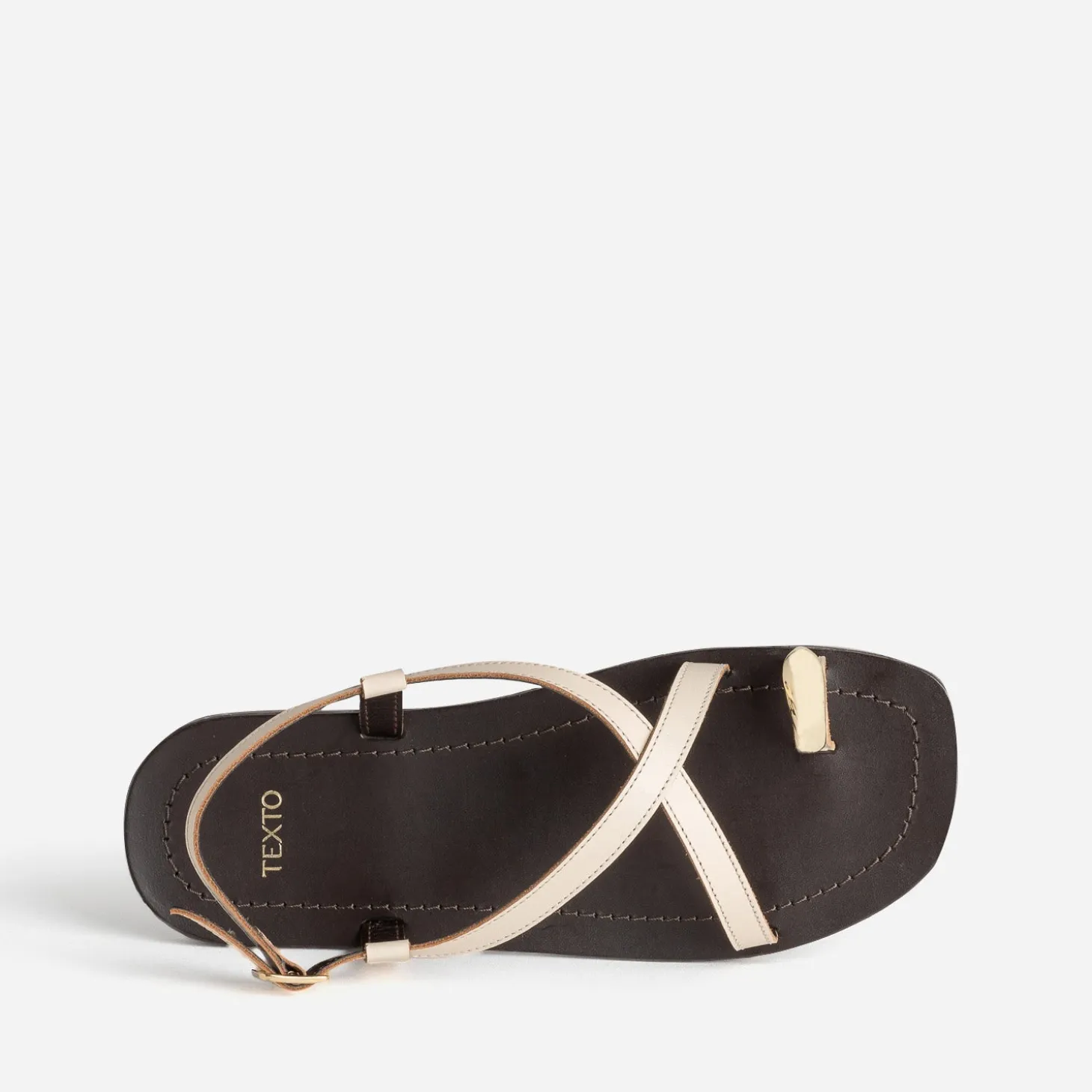 Optez pour un style estival et contemporain avec cette sandale plate pour femme. Appréciez sa ligne épurée associant fines brides croisées en cuir lisse beige et passe-orteil décalé, rehaussé d’un bijou doré en signature. Un modèle qui fait preuve d’originalité sans compromettre son élégance, à oser avec un top uni et un pantalon fluide à imprimé léopard.