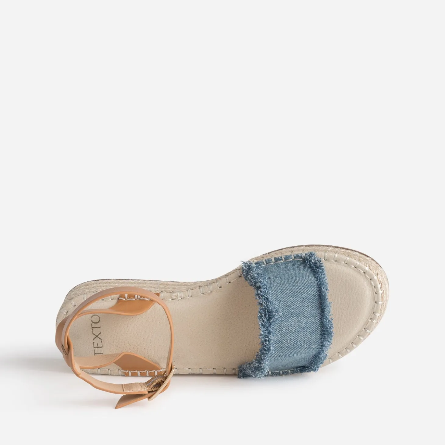 Sur le dessus du pied, une bride large, en textile bleu effet denim, avec bords frangés. Autour de la cheville, une bride en matière synthétique camel. Et une semelle compensée, recouverte de cordes. Cette sandale femme défend un style bohème casual, à associer avec un tee-shirt bleu ciel et une jupe midi en jean.