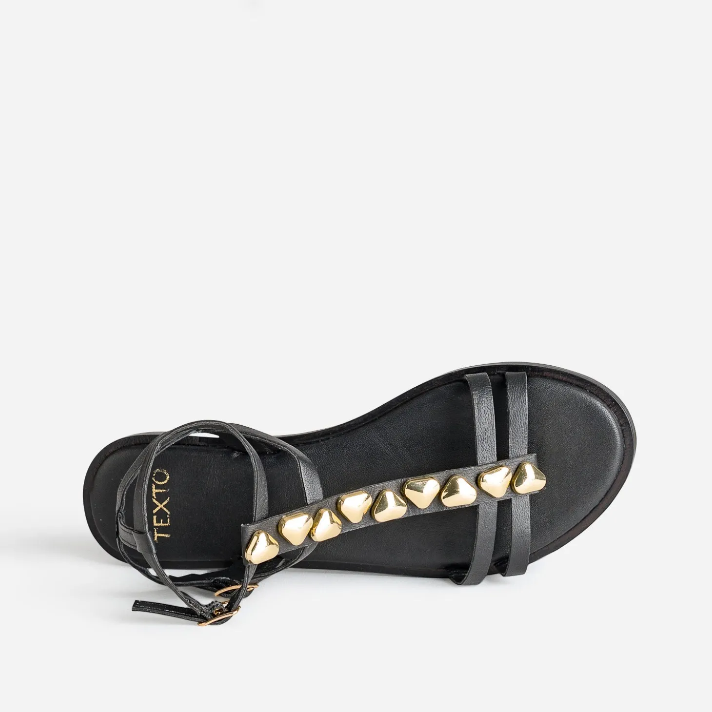Emboîtez le pas à LA tendance chaussures la plus irrésistible de l’été : la sandale-bijou. La ‘toe ring sandal’ se caractérise par une bride en T, décorée ici de clous fantaisie dorés sur cuir noir. Son grand avantage, c’est son confort lié à la semelle plate. Un modèle avec double bride autour de la cheville et sur le dessus du pied, à mettre en valeur avec une robe midi et un collier ras-de-cou façon maxi gourmette en métal doré.