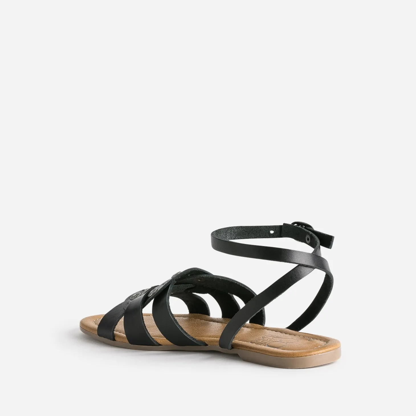 Conçue en cuir, cette sandale plate s’inspire de la tendance ethnique. Noire, elle est décorée de rivets gravés en métal. Un modèle à associer avec un total look noir, et des accessoires en métal. <