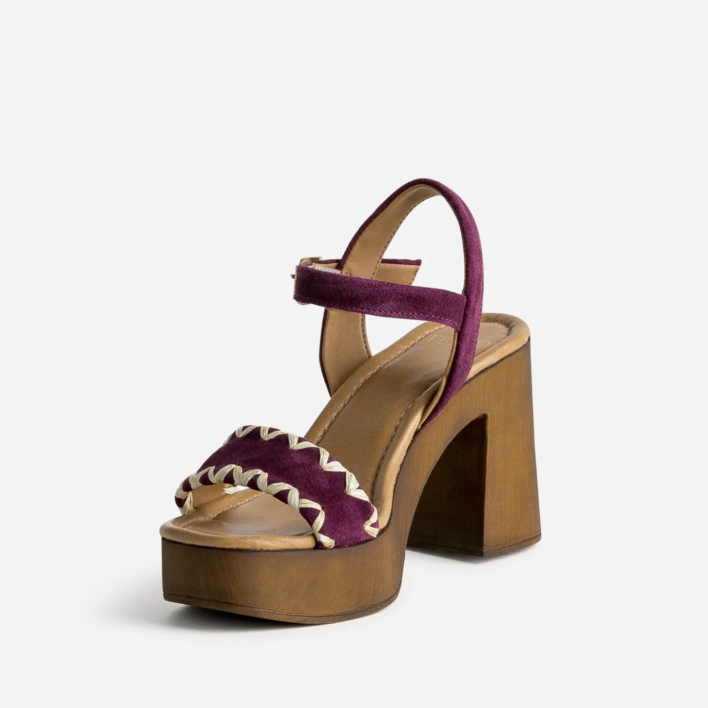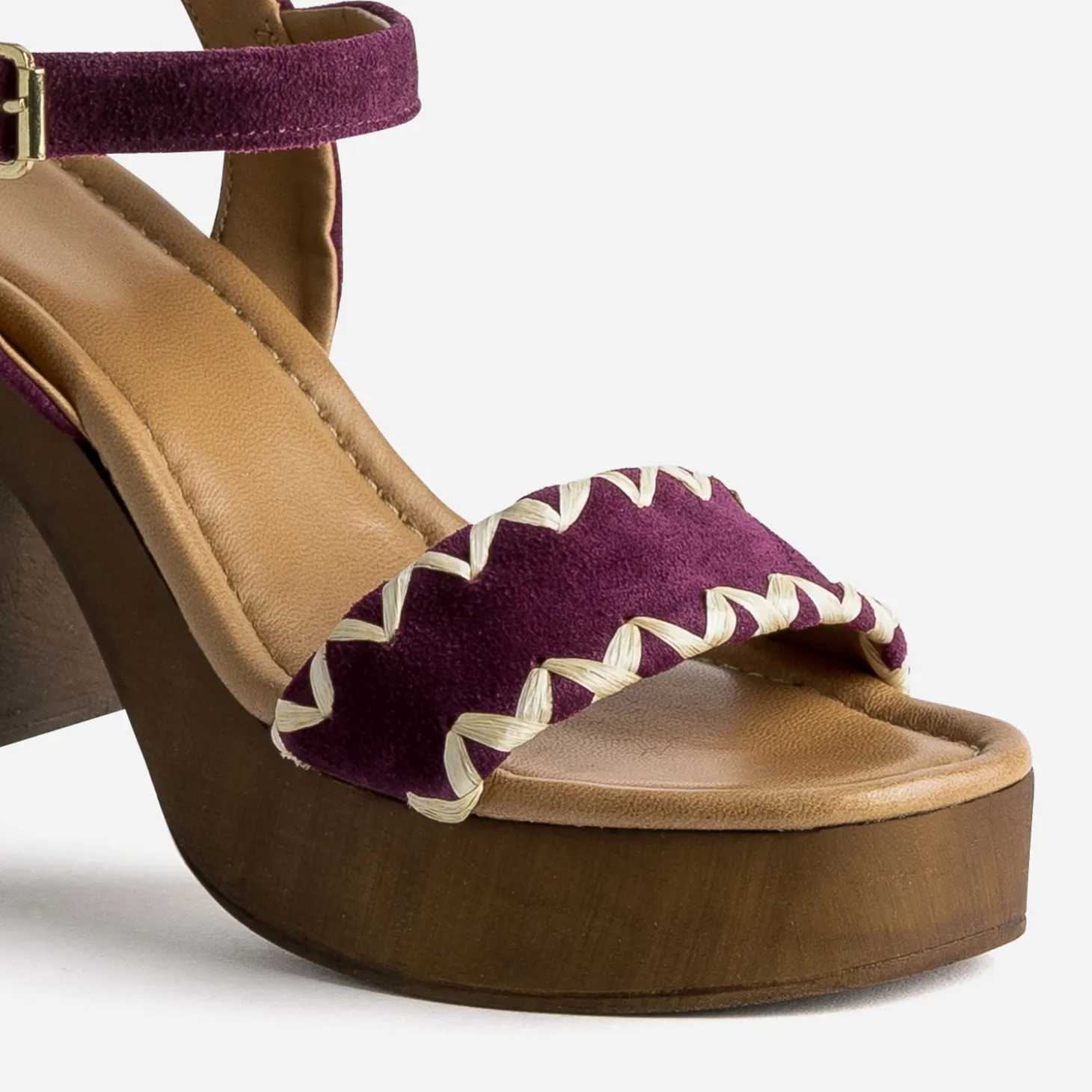 Une maxi plateforme avec talon très large, imitation bois foncé. Un cuir velours prune, avec broderies façon raphia écru. Cette sandale femme impose son style ethnique chic tout au long de la saison. A associer avec un total look camel en journée, ou avec un costume-short imprimé et des bracelets en bois en soirée.