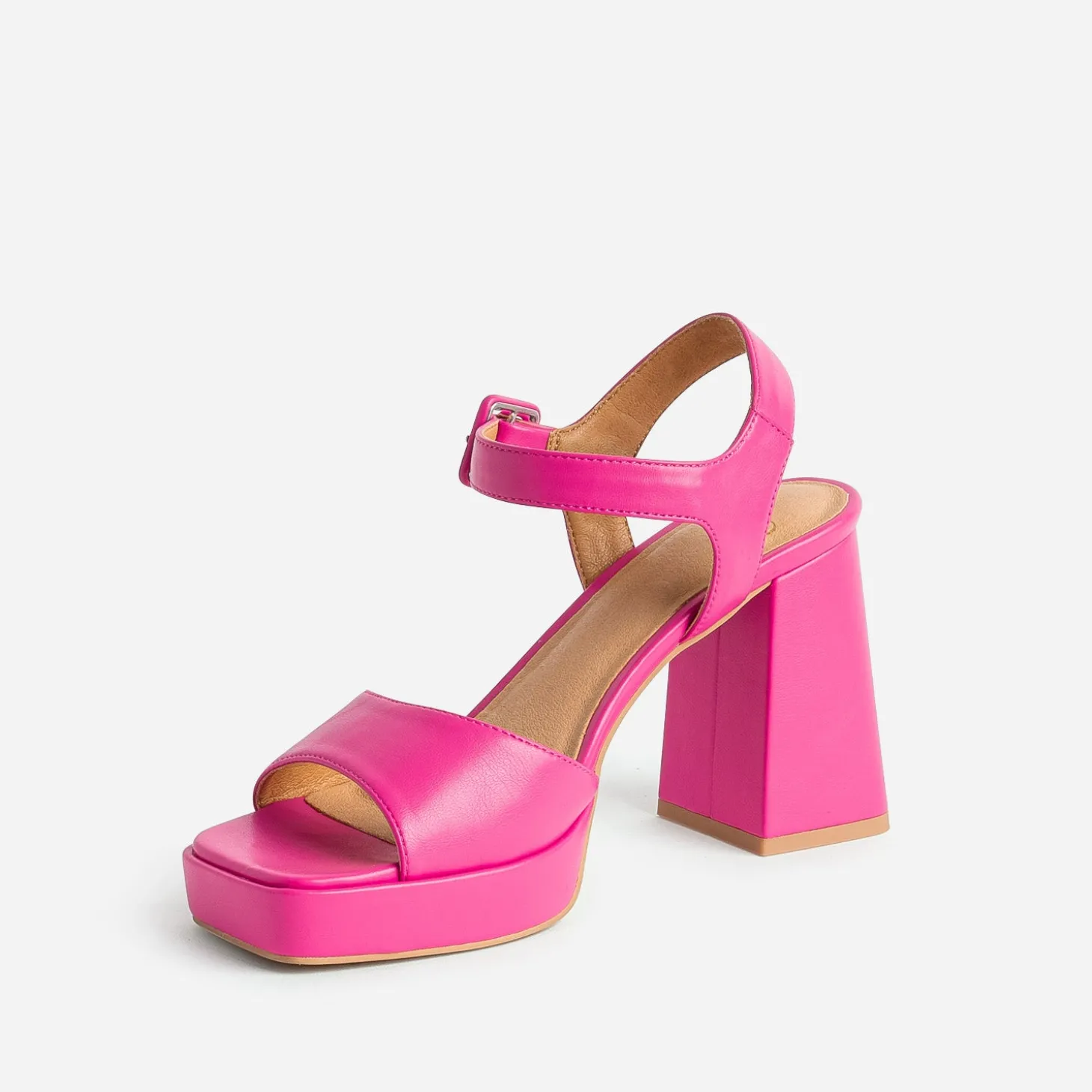 De la couleur, oui ! Mais pas n’importe quelle couleur. Option rose fuchsia validée pour cette sandale femme, qui va assurément faire les beaux jours de vos looks d’été. Inspiration rétro, elle est montée sur un talon flare de 9 cm et une plateforme avant de 2 cm, le tout soulagé par une semelle première moussée. De son bout carré jusqu’à la boucle recouverte, la finition mate apporte une vraie touche de modernité. Vous hésitez ? Essayez-la avec du bleu canard ou du vert anis, du prune ou du vert cèdre.