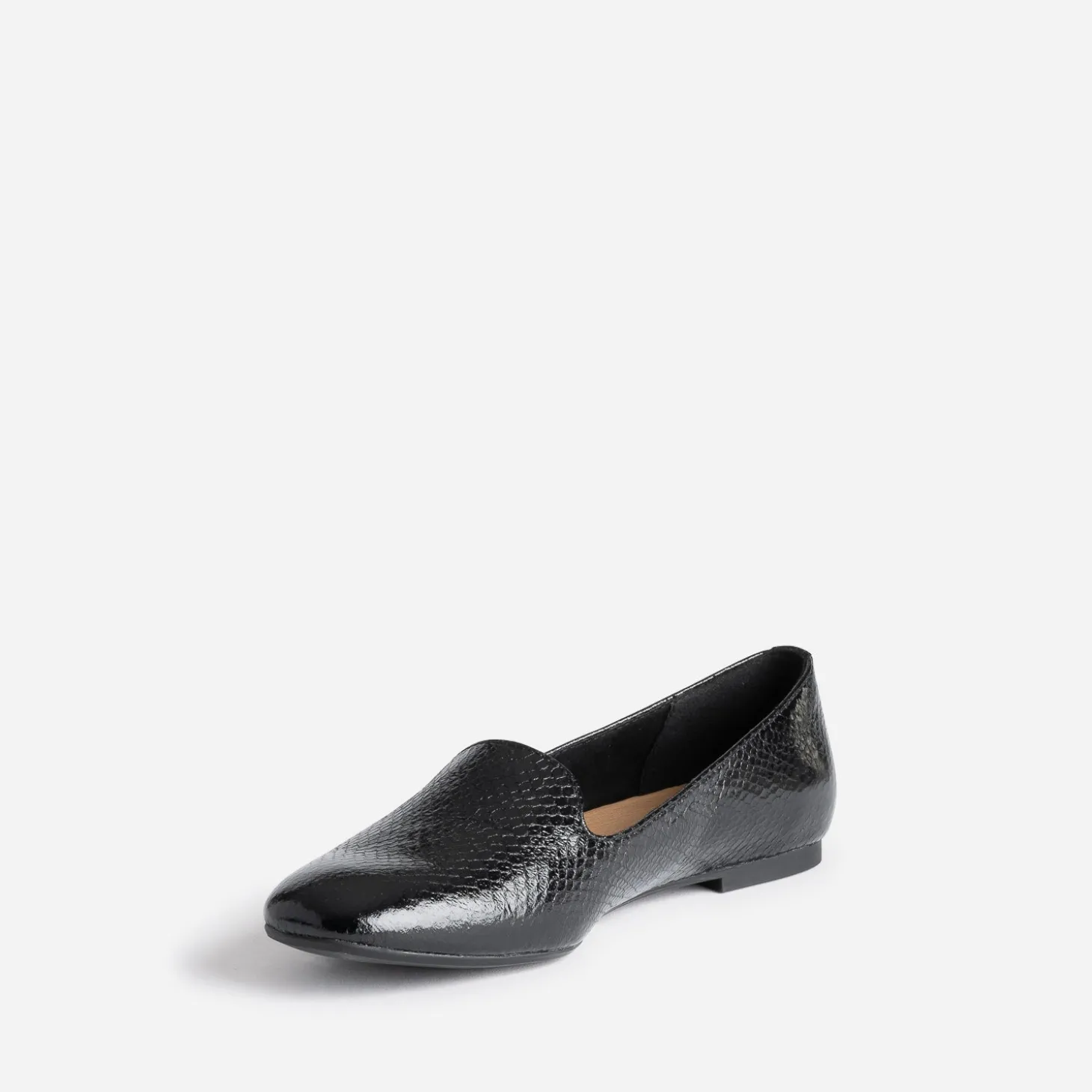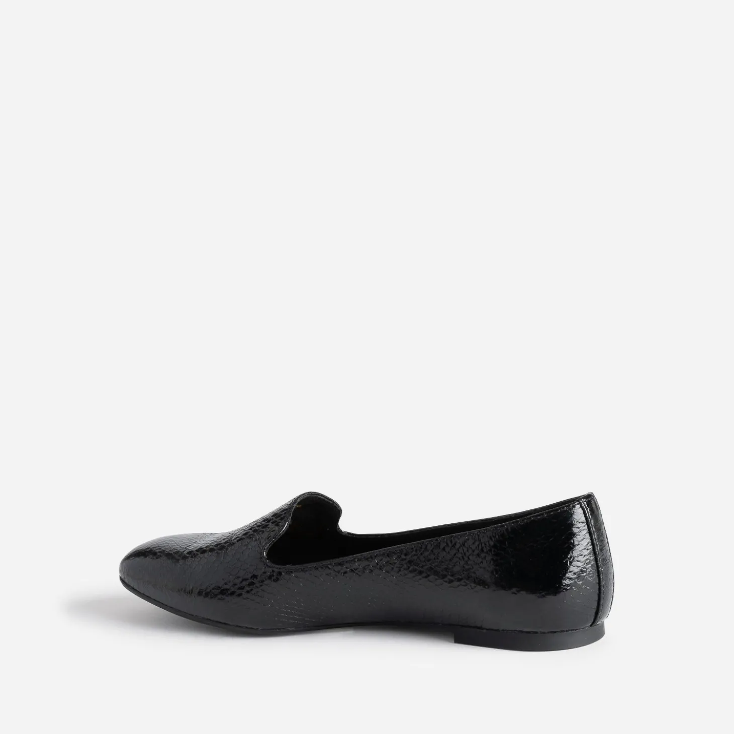 Avec son motif effet python sur finition vernie, ce slipper femme s’invite sur le podium des tendances du moment. En cuir synthétique noir et aussi confortable que des chaussons, il s’enfile en un clin d’œil, de préférence nu-pieds. Renforcez son style preppy, avec un costume noir ou gris.