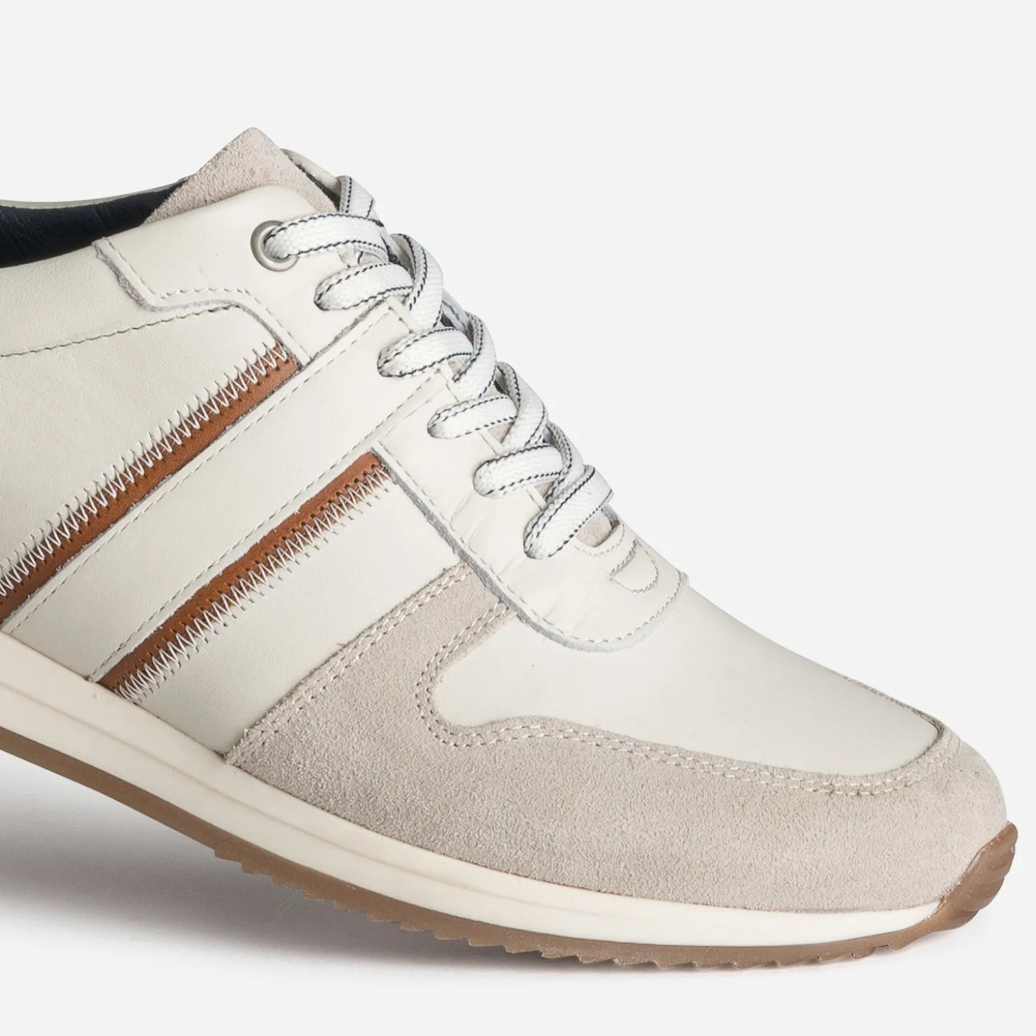 Mélange de cuir et cuir velours, la tennis pour homme s’offre une nouvelle interprétation. Beige clair, marron et bleu marine, elle associe des couleurs dans une belle harmonie. La semelle intérieure est amovible, afin d’y glisser une semelle plus adaptée et gagner en confort. Un modèle à privilégier avec une tenue décontractée, polo beige et pantalon chino ou bermuda bleu marine.