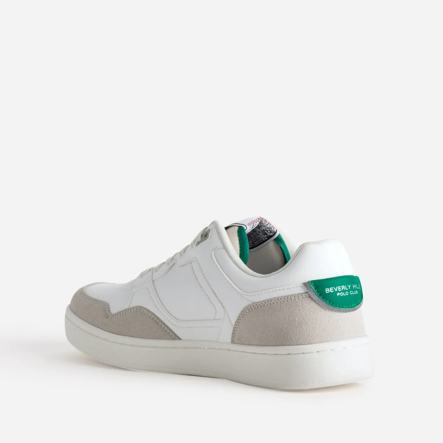 Cette tennis pour homme est une proposition simple, dans l’air du temps. En matière synthétique lisse, elle est soulignée de détails beiges et d’un contrefort vert vif. Les logos rythment la languette par une étiquette tissée, le côté par une broderie, l’arrière par un marquage métallisé. Un modèle à préférer avec une tenue décontractée, polo blanc et pantalon chino beige.