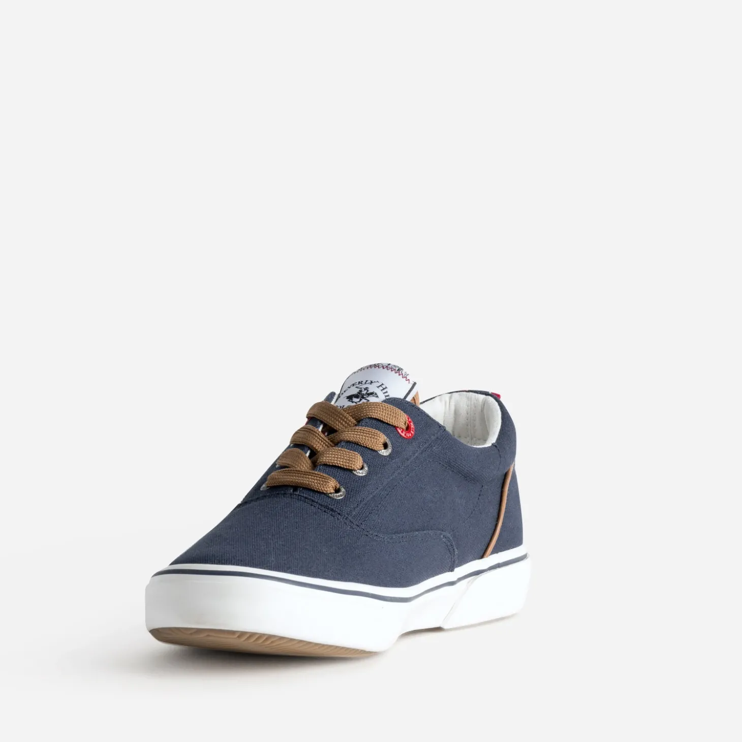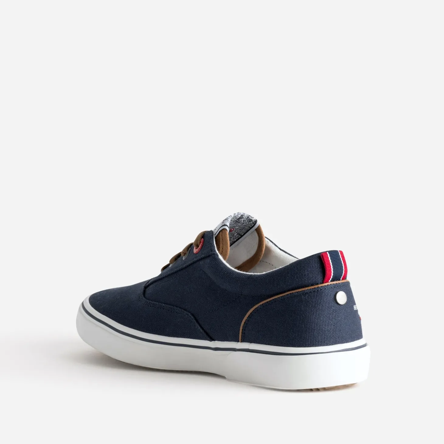La tennis en toile est un modèle incontournable du shoesing d’été. Bleu marine, elle se ferme par un lacet marron, en écho au biais qui souligne le contrefort. Sur la languette, sur le côté, le logo cavalier emblématique s’impose version étiquette tissée ou broderie. Un modèle idéal, en vacances ou en week-end, avec un polo bleu et un bermuda en jean brut.