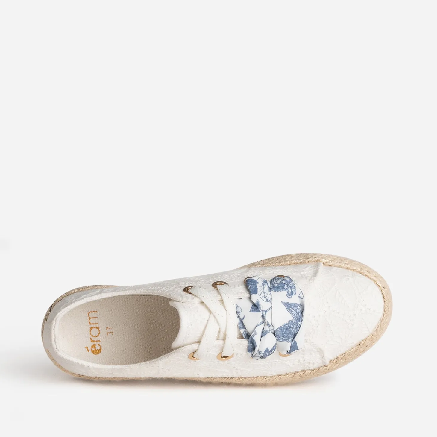 Mi-tennis, mi-espadrille, cette sneakers s’invite dans votre shoesing d’été. En toile blanche, elle se démarque par de délicates broderies ton sur ton et est montée sur une semelle à plateforme de 3 cm. Sa particularité : elle est livrée avec deux lacets, l’un plat avec une ligne dorée, et l’autre façon foulard, rythmé d’un imprimé fleurs bleues. Portez-la au quotidien avec un jean boyfriend délavé et un top romantique en dentelle, à basque.