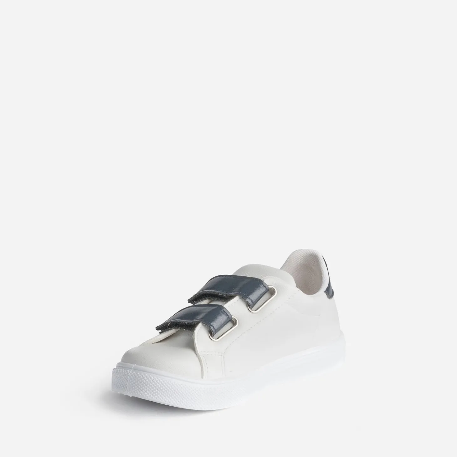 Matière synthétique lisse blanche, double scratchs marine, en écho au contrefort, la nouvelle tennis prône un retour à la simplicité. Un modèle mixte, facile à associer avec toute sa garde-robe.