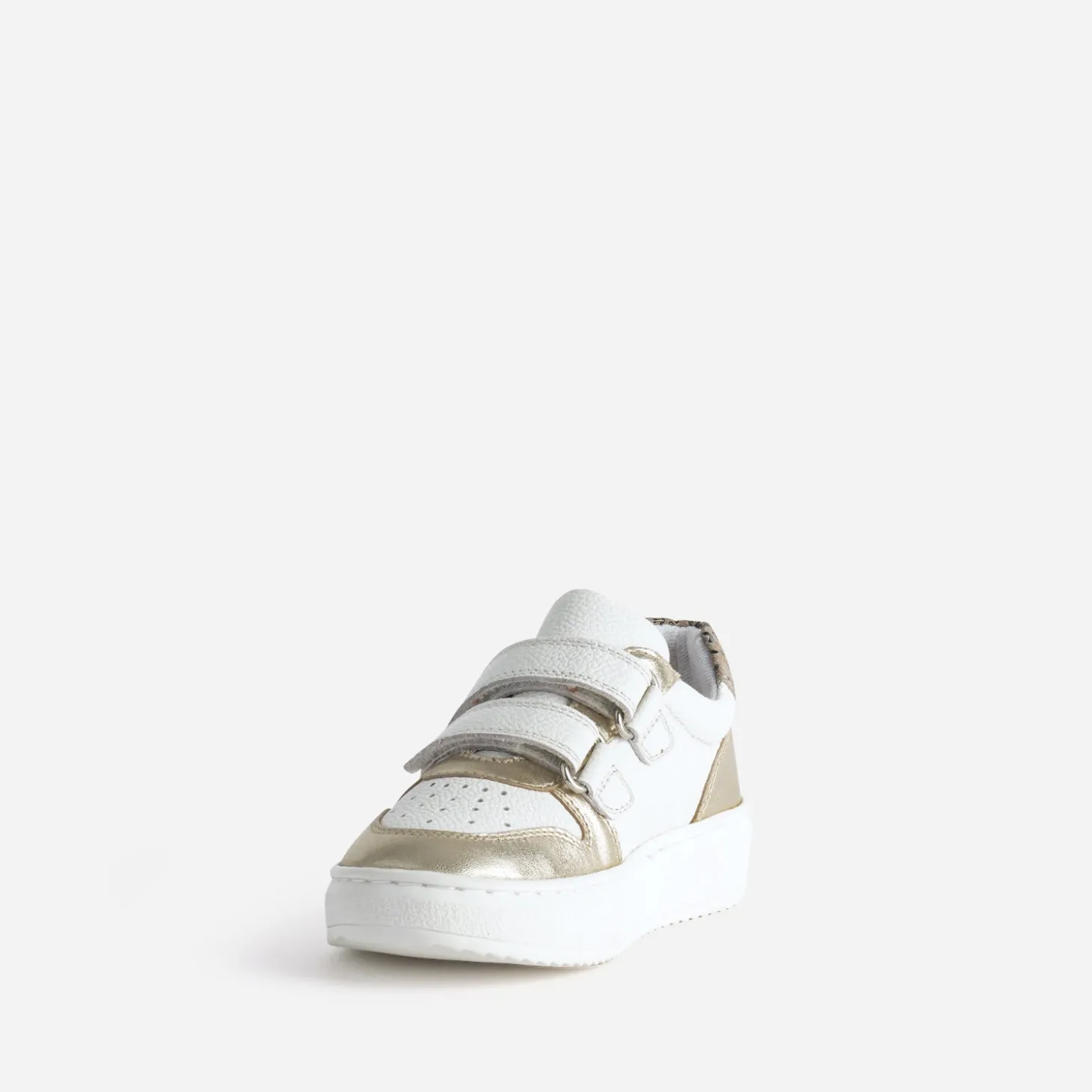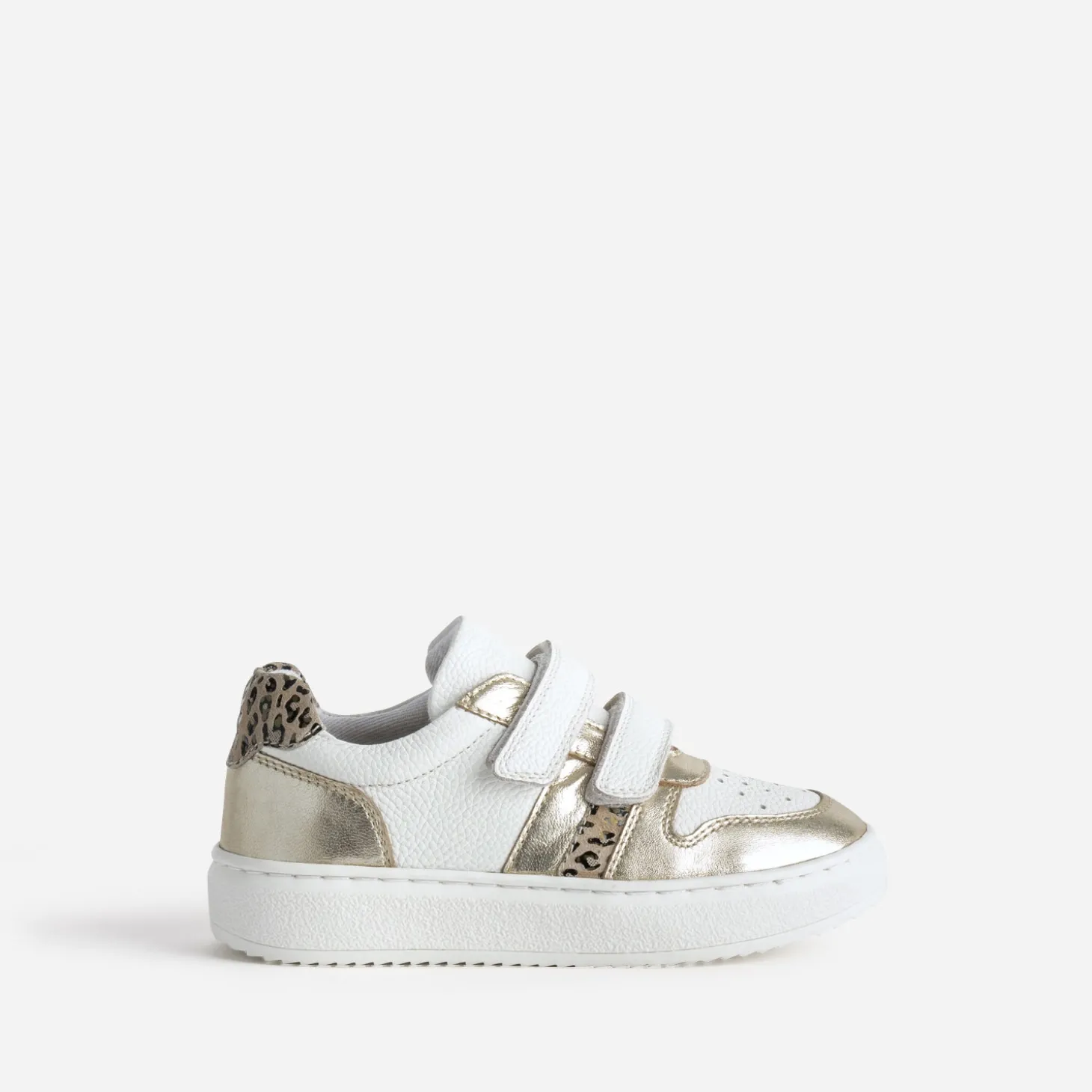 Dublanc, du doré, du motif léopard. Nouveau trio à suivre, de la cour de récré aux fiestas programmées. Une tennis tout cuir qui va forcément plaire aux petites filles. Elle se ferme par scratchs, pour les accompagner dans leur autonomie. Un modèle facile, tant avec un total look denim qu’avec un combishort kaki.