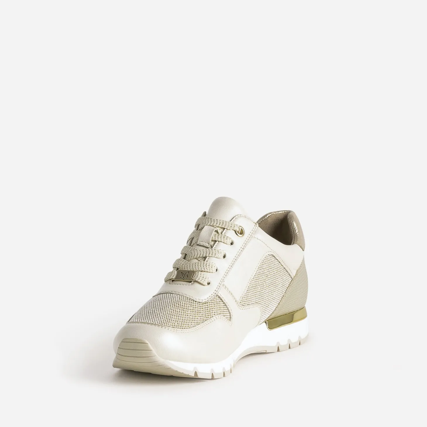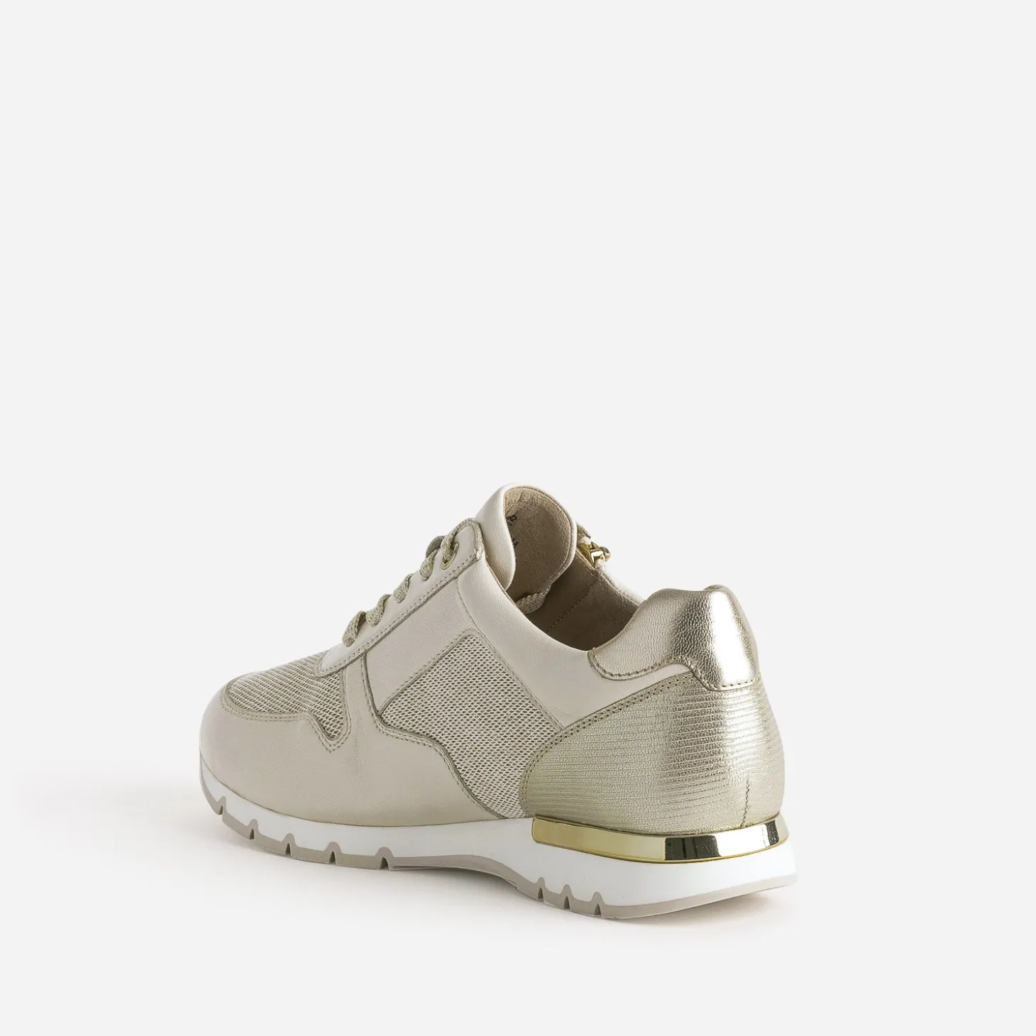 Vous aimez marcher ? Essayez cette nouvelle sneakers basse pour femme. D’abord pour sa doublure en cuir et pour sa première en cuir qui bénéficie de la technologie ‘onAIR’, garantissant un meilleur amorti et une parfaite aération de la chaussure. Montée sur une semelle sport, crantée pour une adhérence optimale sur toutes les surfaces, elle séduit par ses associations de cuir lisse beige, cuir rainuré doré et textile beige pailleté. Un modèle fermé par lacet et zip latéral, à privilégier avec une tenue casual.