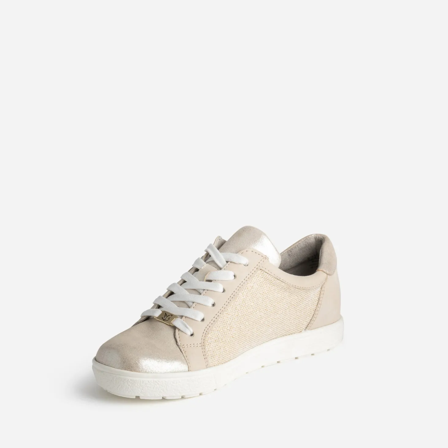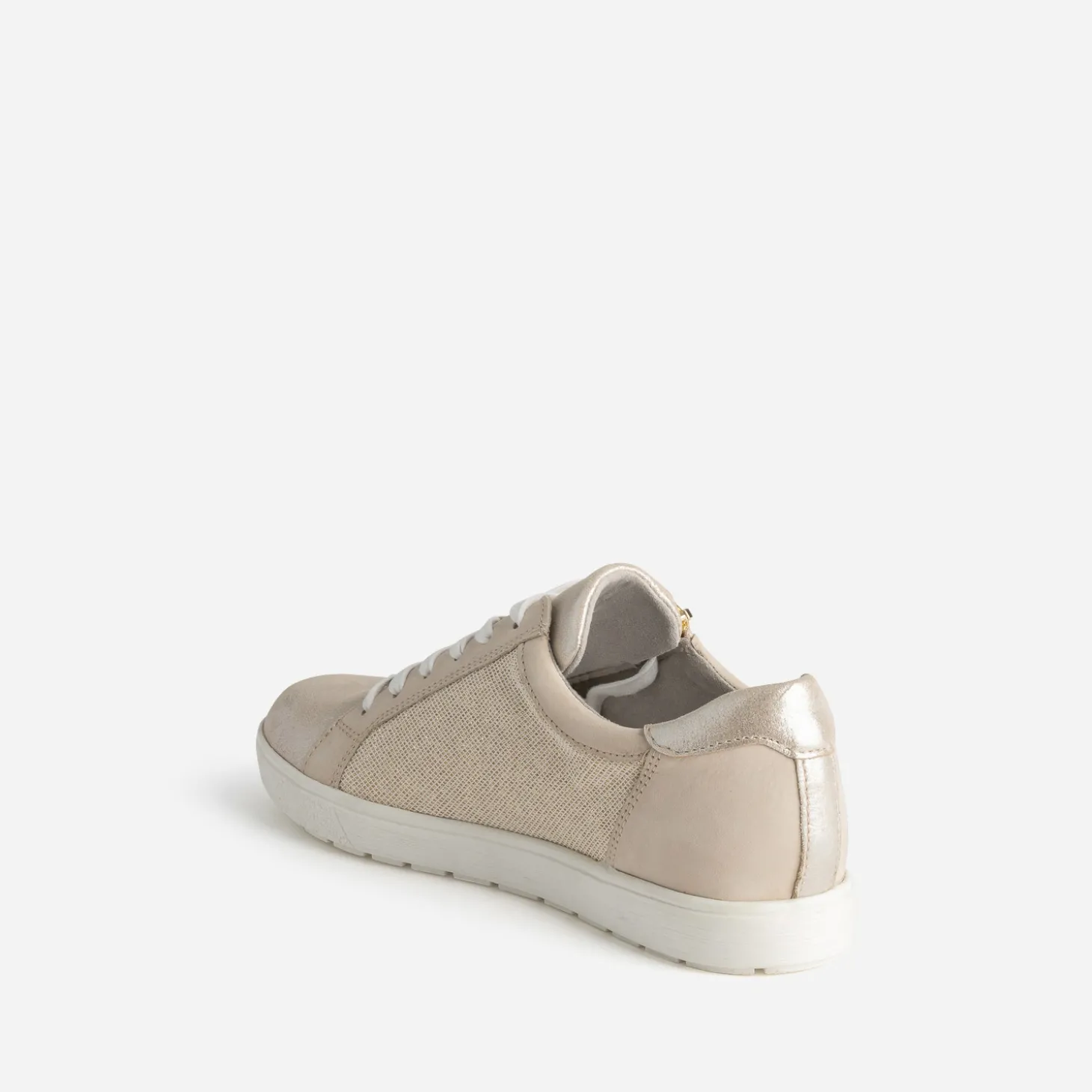 Découvrez le nouveau design de la tennis femme. Laissez-vous séduire par sa souplesse indiscutable. Mix de cuir et textile, elle est dotée de la technologie ‘onAIR’, garantissant un meilleur amorti et une aération optimale de la chaussure. Beige et dorée, elle présente une finition pailletée sur les côtés. Le laçage est renforcé par un système de fermeture complémentaire par zip extérieur. Un modèle idéal pour tous les jours, qui va vraiment soulager votre démarche.