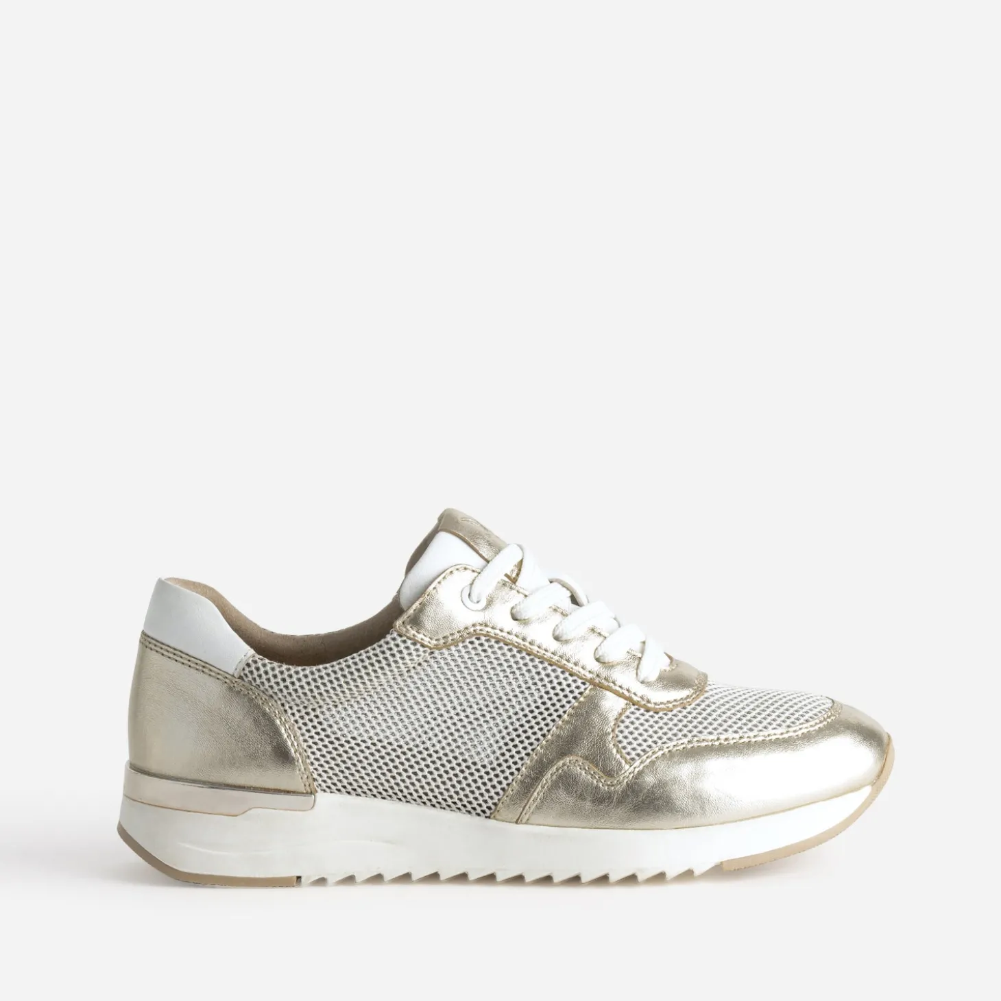 Légèreté, style, confort. Trois mots choisis avec soin pour décrire cette tennis femme. De couleur dorée, elle mixe les matières, cuir lisse et mesh, dans une belle harmonie. Son atout ? C’est sa semelle intérieure amovible, prévue pour accueillir une semelle plus adaptée si besoin. Un modèle à tester avec des teintes naturelles, du blanc au marron, ou pastel.