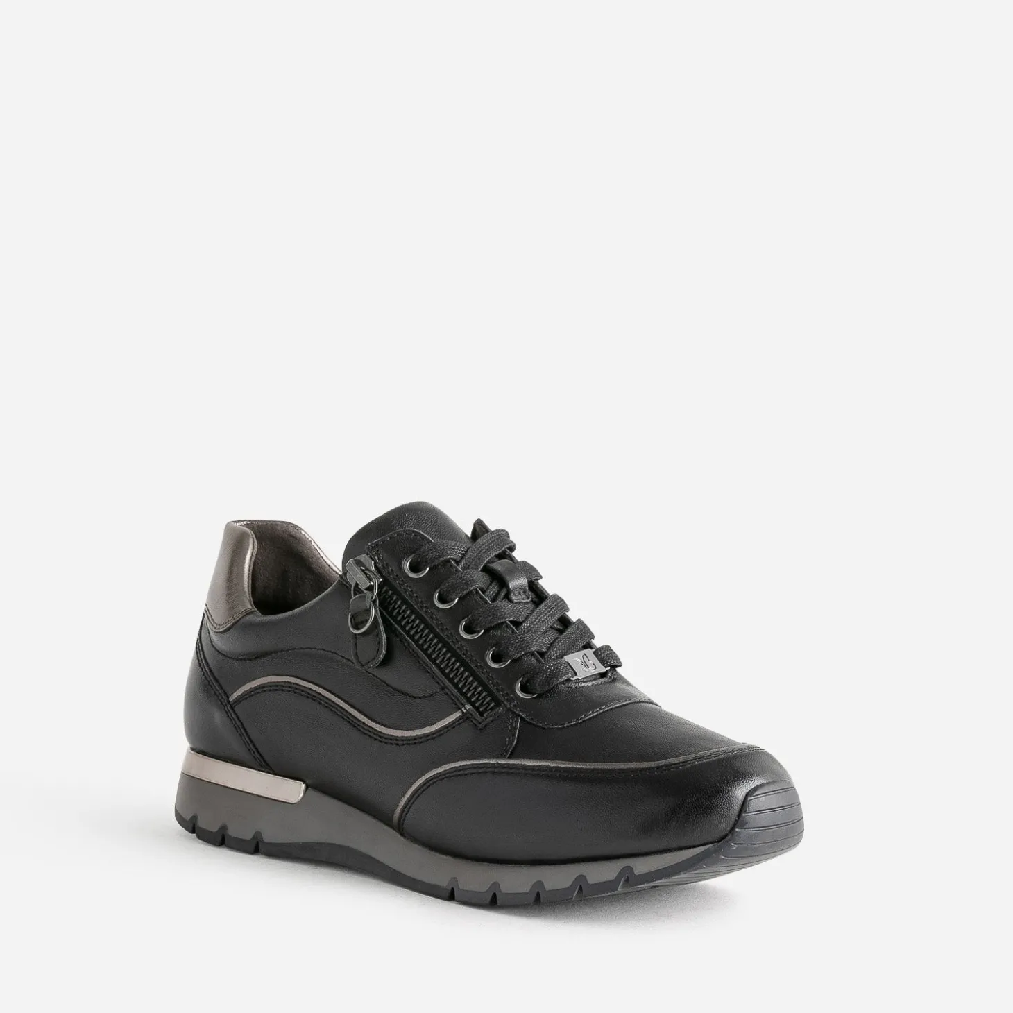 Vous aimez marcher ? Essayez cette nouvelle sneakers basse pour femme. D’abord pour sa doublure en cuir et pour sa première en cuir qui bénéficie de la technologie ‘onAIR’, garantissant un meilleur amorti et une parfaite aération de la chaussure. Montée sur une semelle sport, crantée pour une adhérence optimale sur toutes les surfaces, elle séduit par son cuir noir, souligné d’un contrefort bronze. Un modèle fermé par lacet et zip latéral à privilégier avec une tenue casual.