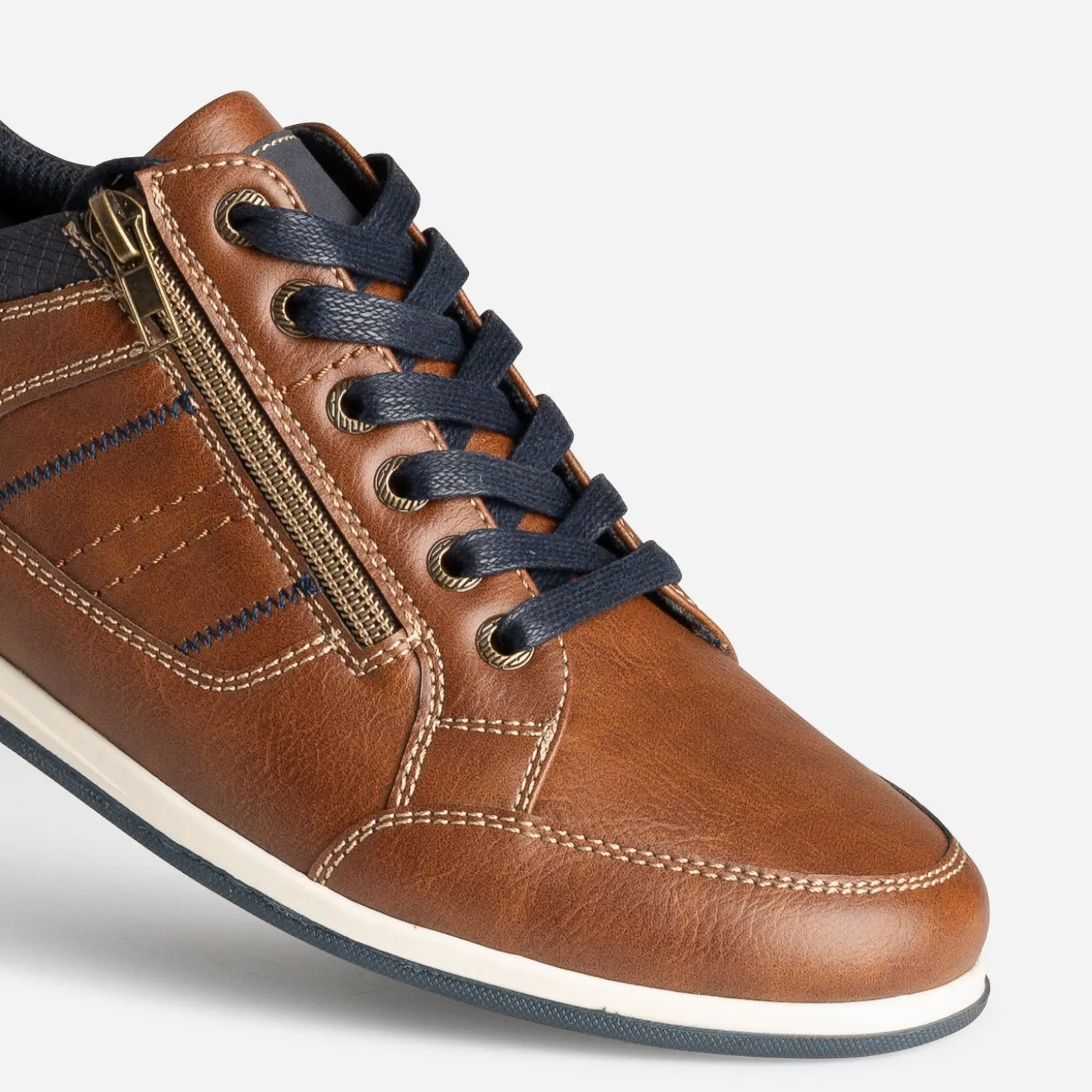 Le duo cognac et bleu marine revient en force sur cette tennis pour homme. En matière synthétique lisse, elle accueille, sur la tige, des jeux de découpes et de surpiqûres. La fermeture par lacet est renforcée par un zip latéral, qui facilite l’entrée et la sortie du pied. Un modèle pensé pour un porté au quotidien, avec un look décontracté.