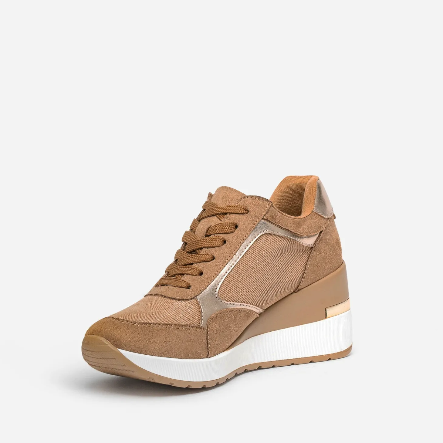 Prendre de la hauteur, même en tennis ? C’est possible avec ce modèle pour femme. Montée sur une semelle compensée de plus de 7 cm, cette basket basse bouscule les codes. Coloris camel, elle maîtrise le mélange de matières à la perfection : matières synthétiques, suédée ou vernie, et mesh pailleté. Le zip extérieur apporte du chic en s’accordant à la baguette dorée placée sur le contrefort. Essayez-la avec un tee-shirt blanc et un pantalon large de couleur foncé.