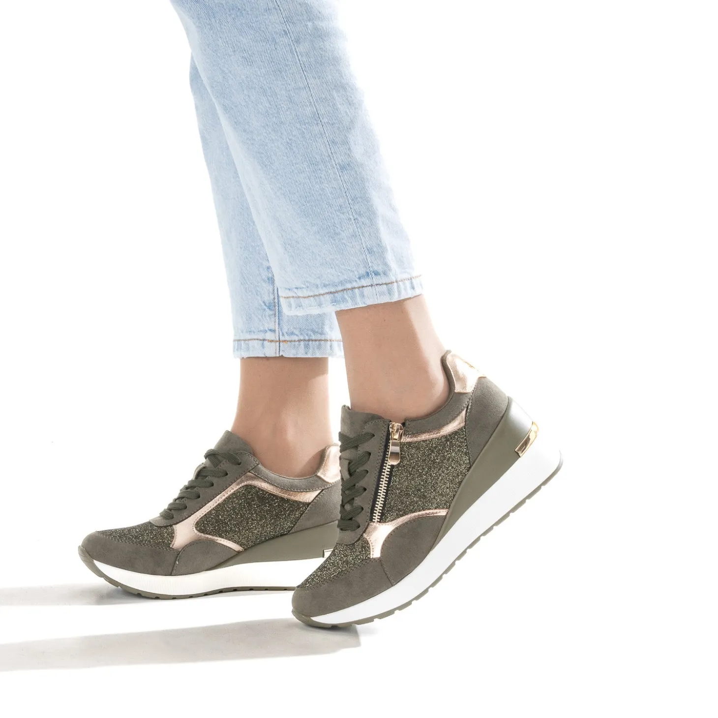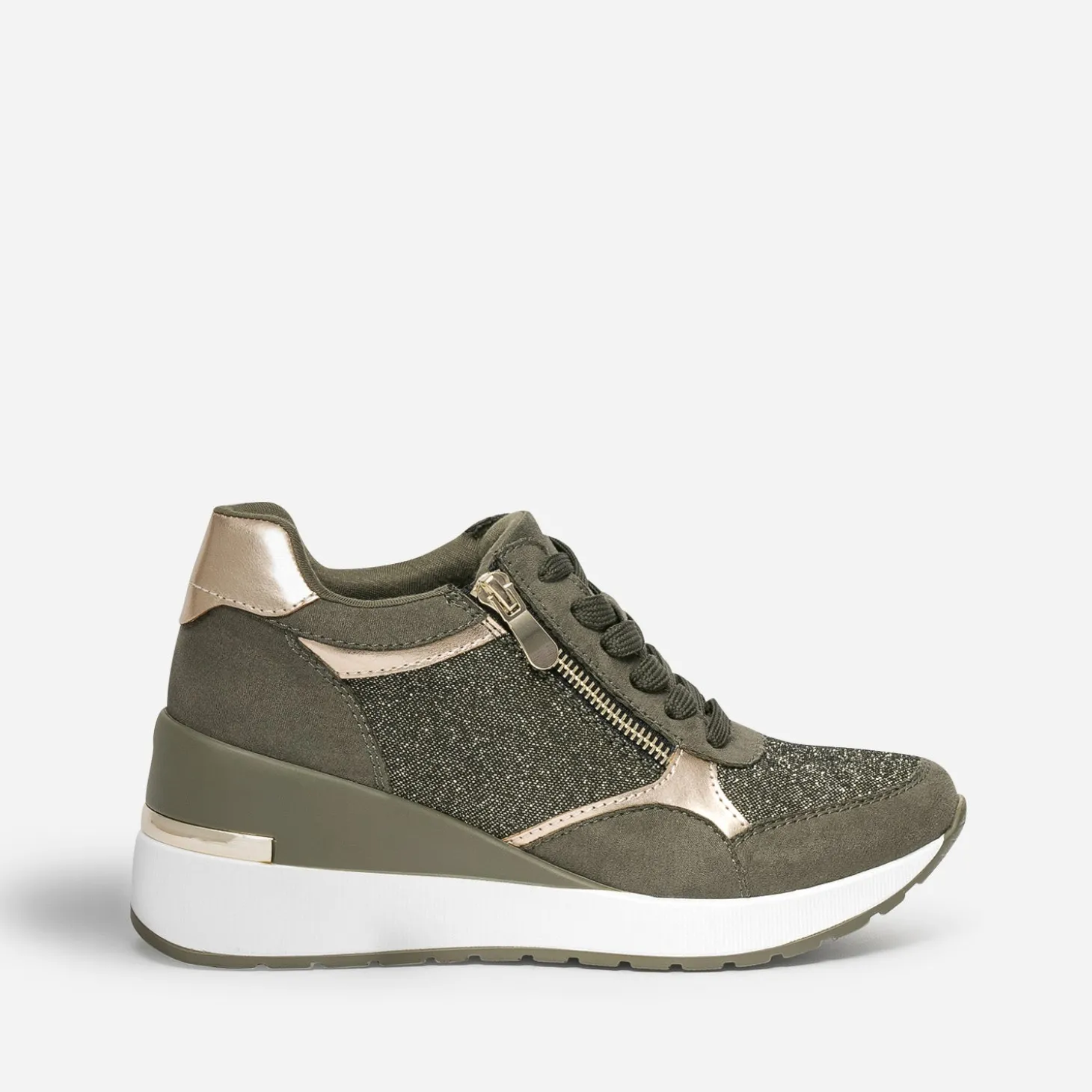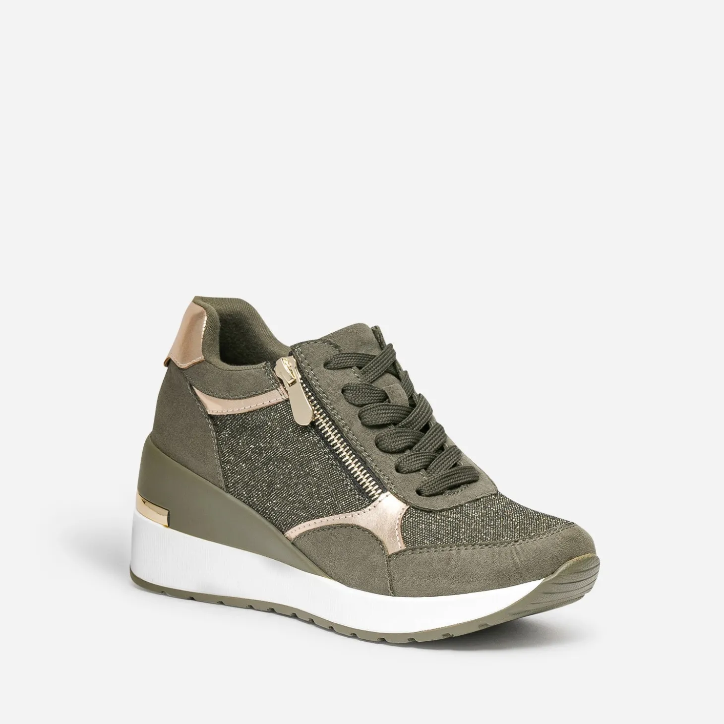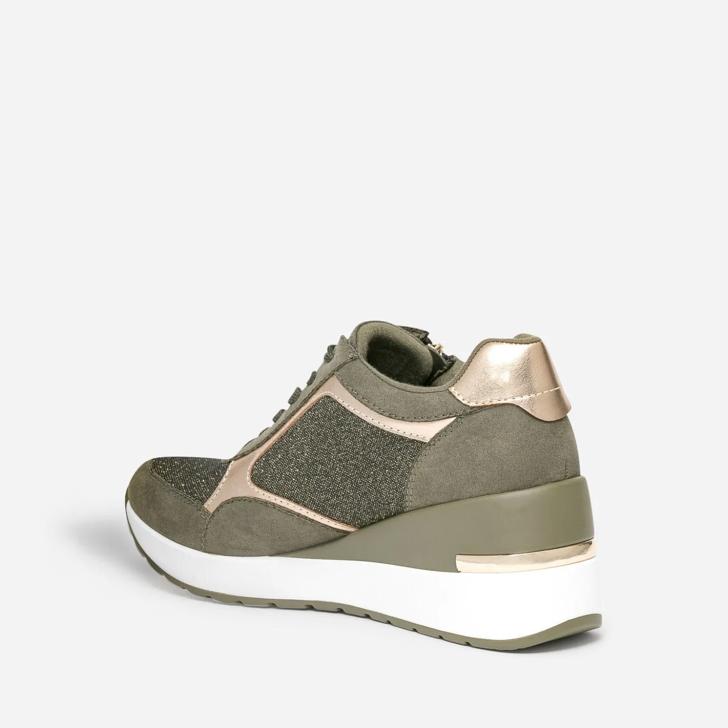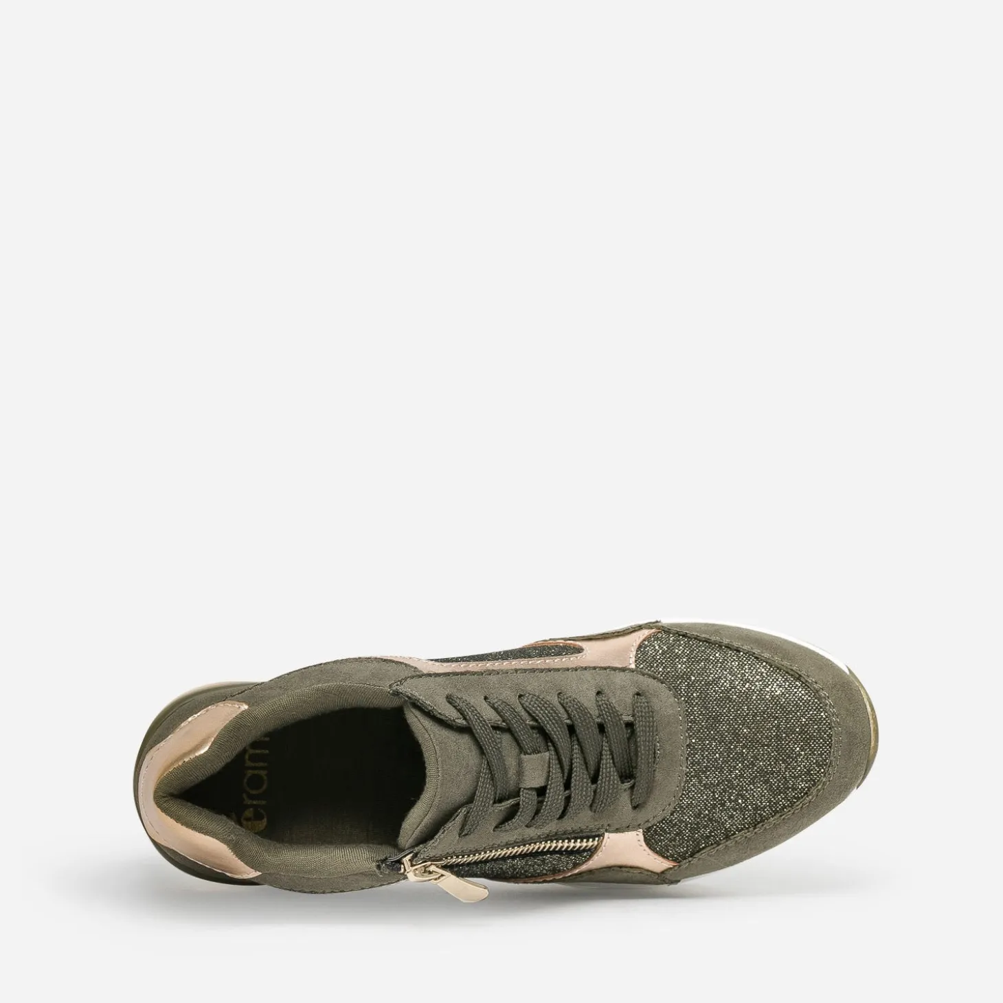 Prendre de la hauteur, même en tennis ? C’est possible avec ce modèle pour femme. Montée sur une semelle compensée de plus de 7 cm, cette basket basse bouscule les codes. Coloris kaki, elle maîtrise le mélange de matières à la perfection : matières synthétiques, suédée ou vernie, et mesh pailleté. Le zip extérieur apporte du chic en s’accordant à la baguette dorée placée sur le contrefort. Essayez-la avec un tee-shirt blanc et un pantalon large de couleur foncé.