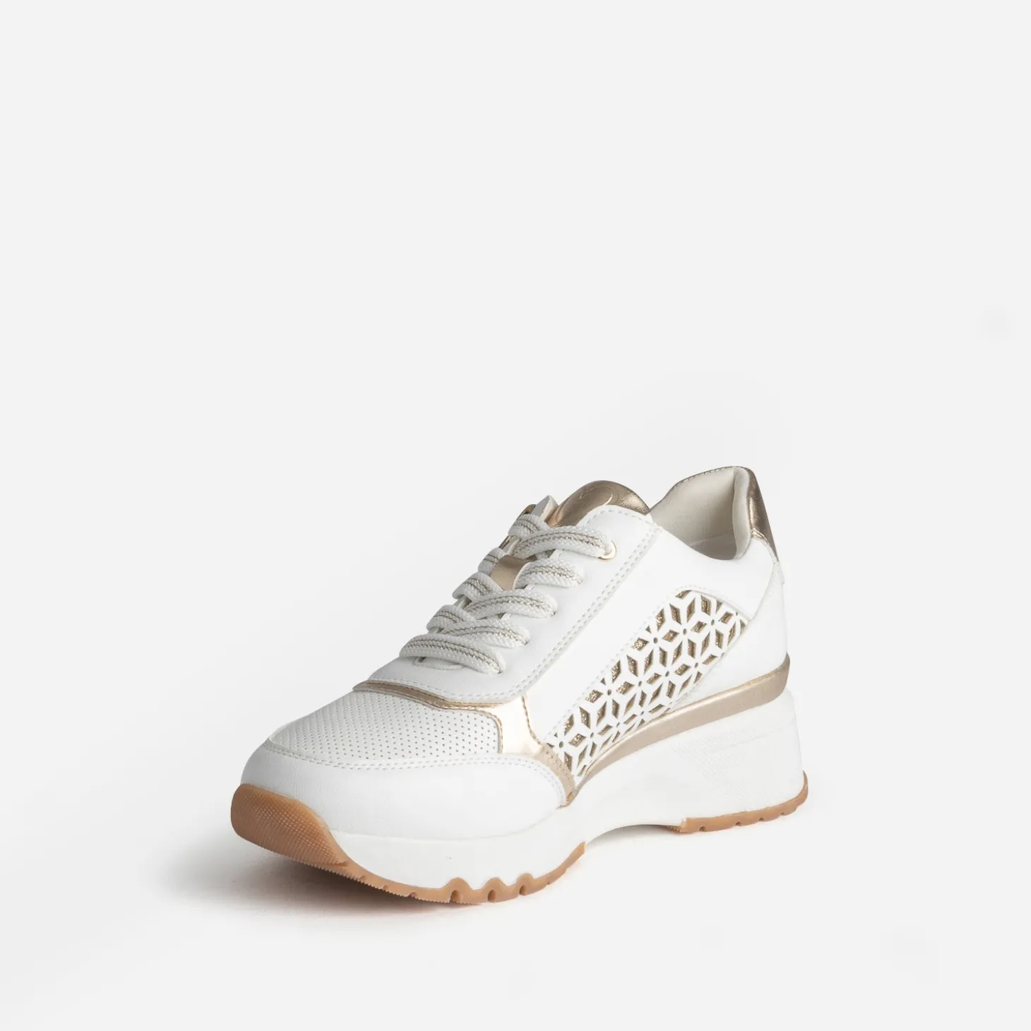 C’est la nouvelle forme de tennis compensée à ne pas manquer cette saison. Mix d’écru et de doré sur une matière synthétique lisse, elle se laisse rythmer de motifs graphiques ajourés sur les côtés et se ferme par lacet et zip latéral. La semelle première est amovible, pour accueillir votre semelle orthopédique adaptée. Alliez confort et mode, sans modération.