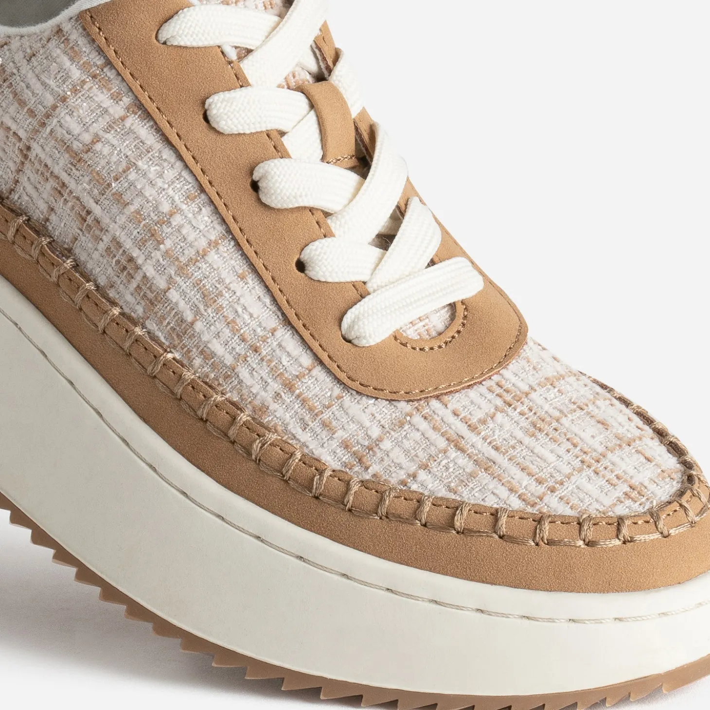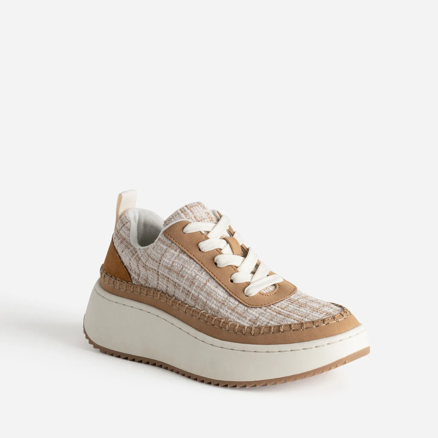 Esprit sport sur semelle compensée : la Dad shoes confirme son statut de tennis, pile dans la tendance. Bi-matière, elle associe un textile écru à motif carreaux à des bordures suédées camel, sur la patte de laçage et le bord de la semelle rythmé de surpiqûres fantaisie. Un modèle idéal pour gagner quelques centimètres sans effort ! Pensez à équilibrer votre look, en privilégiant soit du court (robe, short) soit un vêtement près du corps en haut et un pantalon ou jean large en bas.