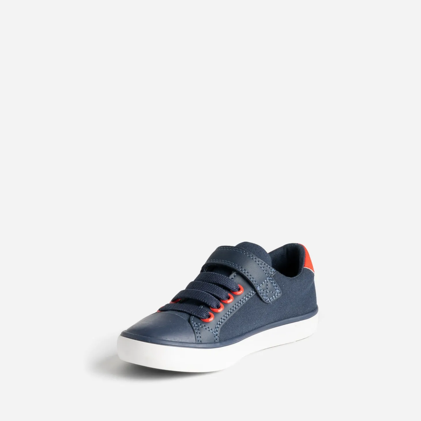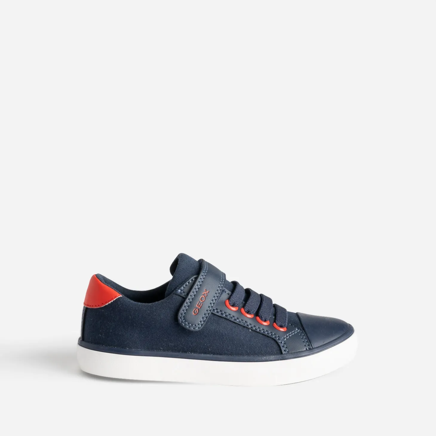 Semelle respirante, grâce au système RespiraTM conçu par Geox, combinant semelle perforée et membrane imperméable qui respire, pour cette tennis pour garçon. En toile, elle présente un bout renforcé, un lacet élastiqué et une fermeture par scratch. Bleu marine, elle se laisse twister de détails rouges sur les œillets et le contrefort.
