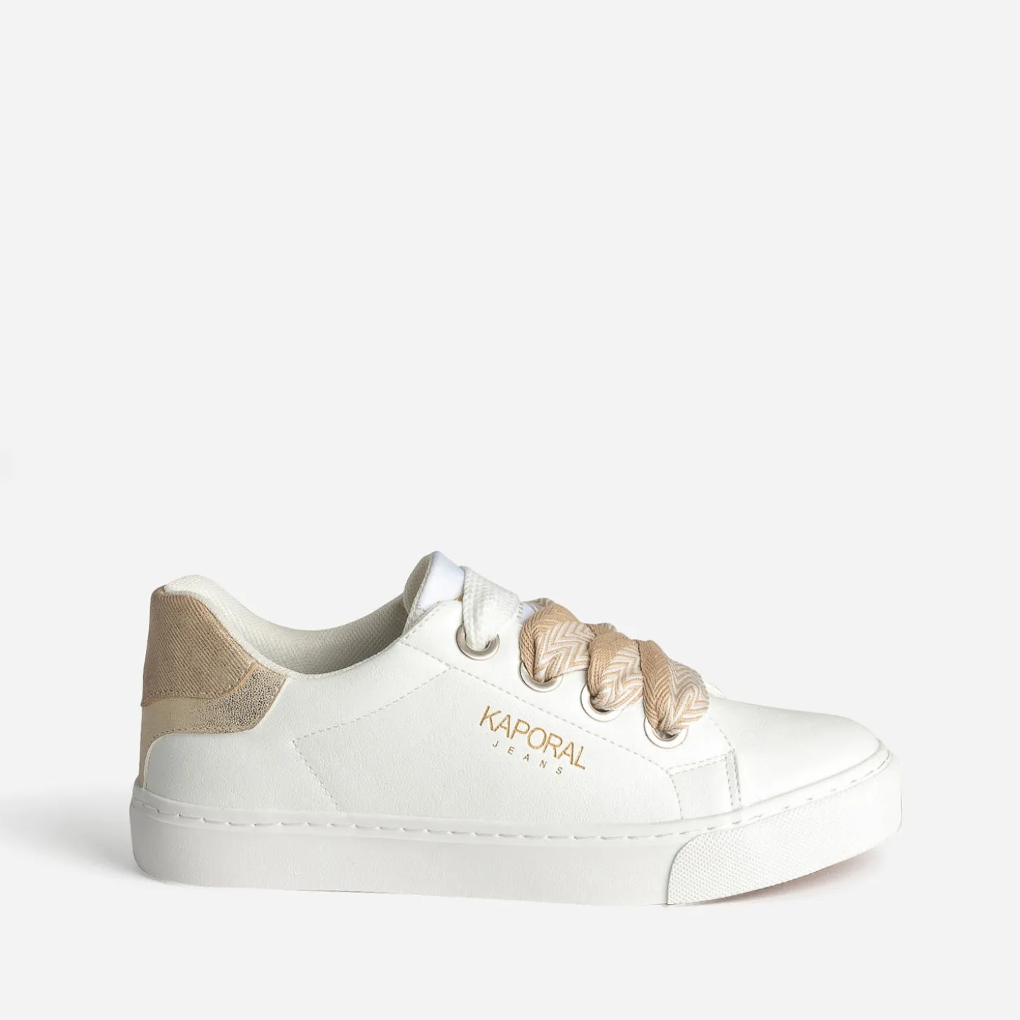 Dessus et languette lisses, contrefort métallisé doré, le tout en matière synthétique, doublure et première 100% textile, cette tennis pour femme est un parfait équilibre entre mode et confort. Déclinée en coloris blanc, elle est livrée avec deux paires de lacets, un à motif chevrons beige et blanc et un ton sur ton. Un modèle facile à adapter à votre look ou votre humeur du moment.