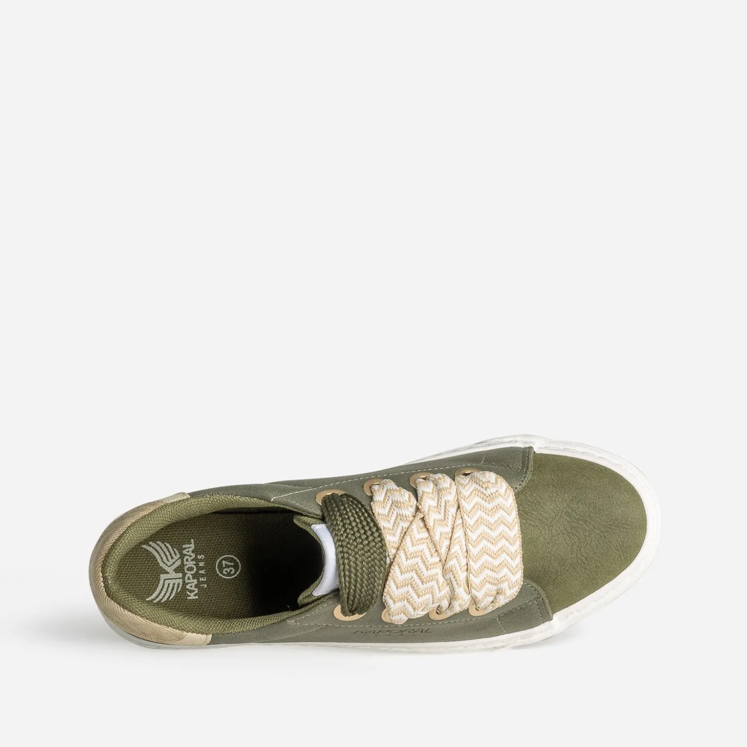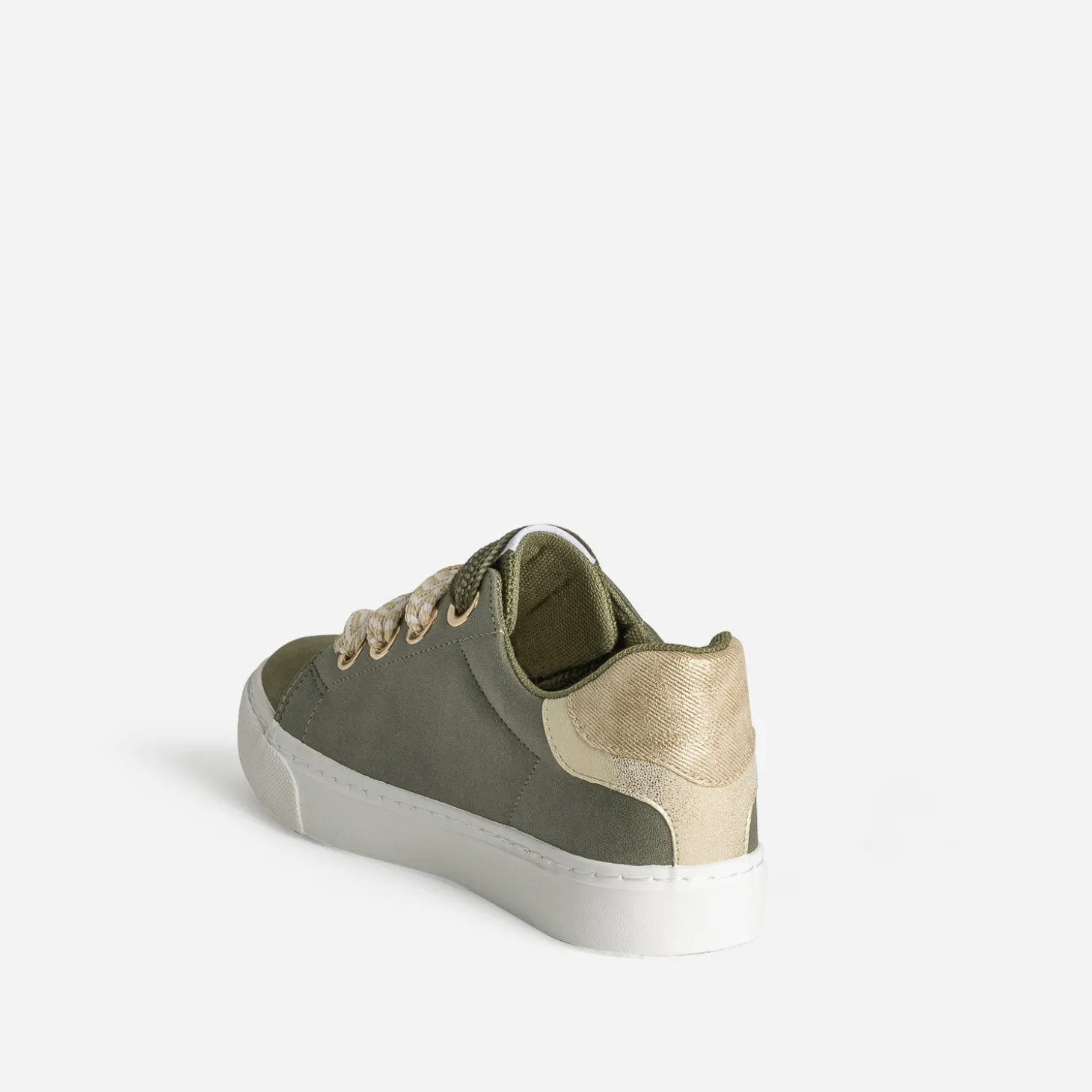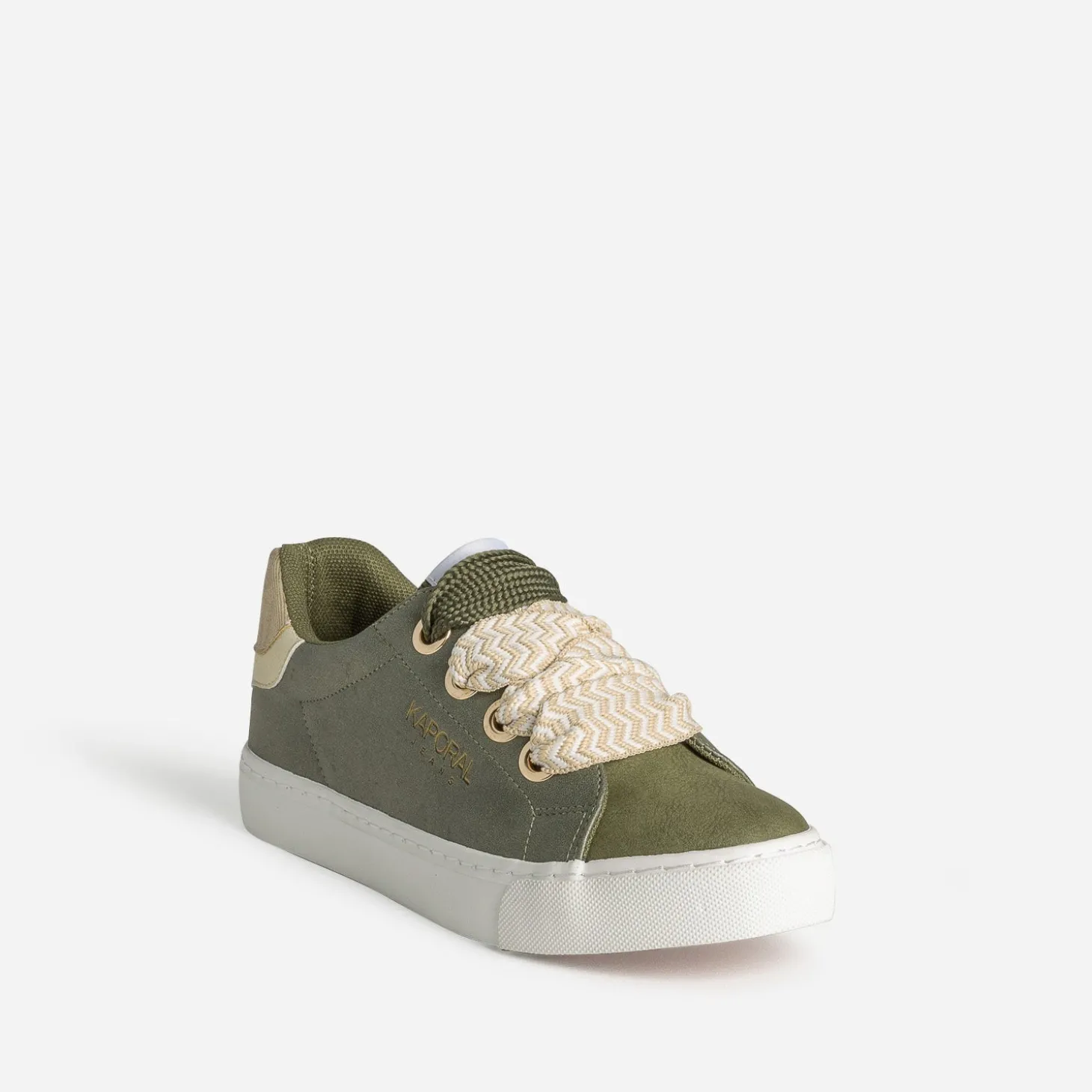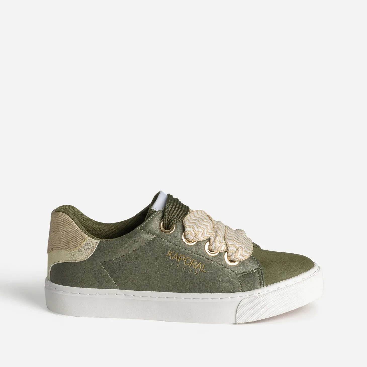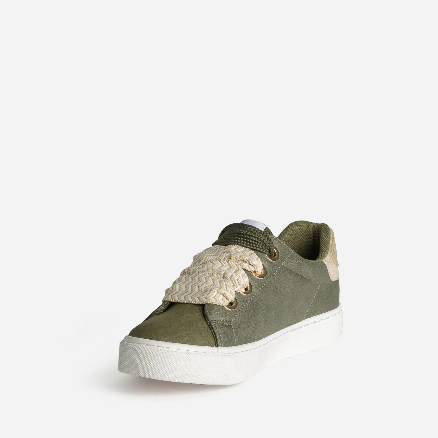 Bout du pied et languette lisses, tige légèrement irisée, contrefort métallisé doré, le tout en matière synthétique, doublure et première 100% textile, cette tennis pour femme est un parfait équilibre entre mode et confort. Déclinée en coloris kaki, elle est livrée avec deux paires de lacets, un à motif chevrons beige et blanc et un ton sur ton. Un modèle facile à adapter à votre look ou votre humeur du moment.