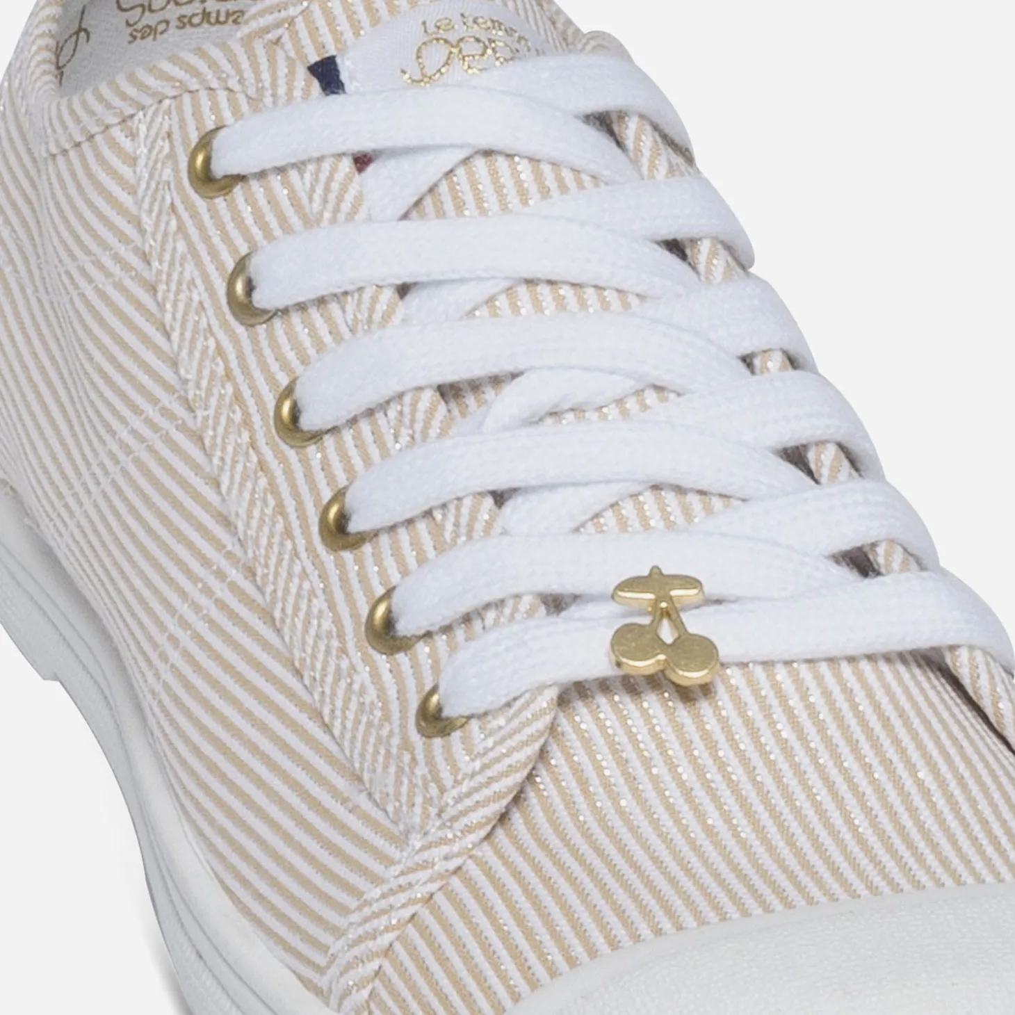 Cette tennis est un classique de la marque. En toile beige, elle est animée de rayures blanches et argent, rythmée de découpes et décorée d’un charm’ cerises en métal ton sur ton glissé sur le lacet. Languette et doublure intérieure accueillent un marquage noir, et le talon, un patch brodé cerises. Une basket basse pour femme, qui affirme sa différence.