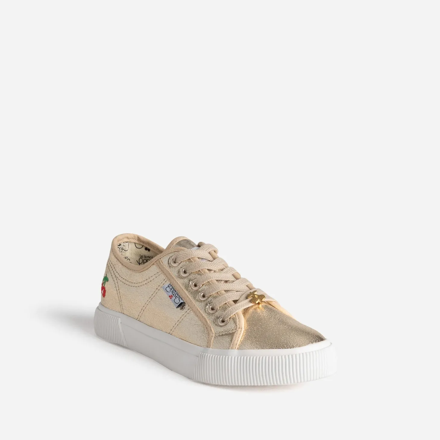 Cette tennis est un classique de la marque. En toile dorée unie, elle est rythmée de découpes et décorée d’un charm’ cerises en métal jaune glissé sur le lacet. La doublure intérieure accueille un marquage logos noirs, la languette, une étiquette tissée, et le talon, une broderie cerises. Une basket basse pour femme, qui affirme sa différence.