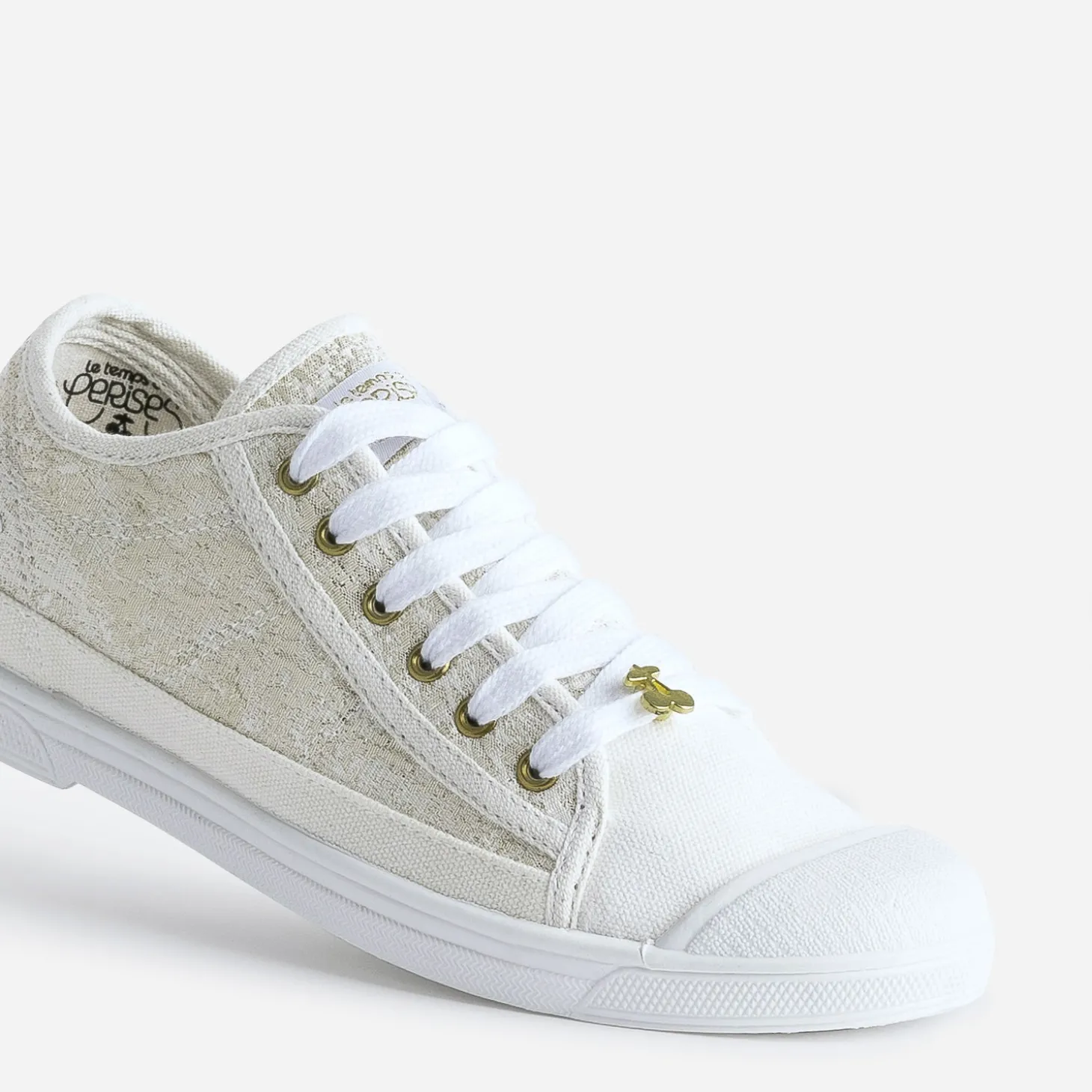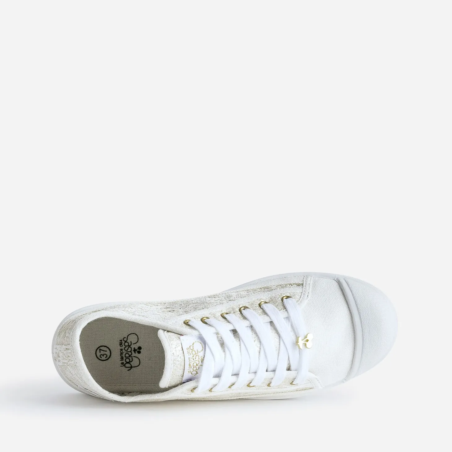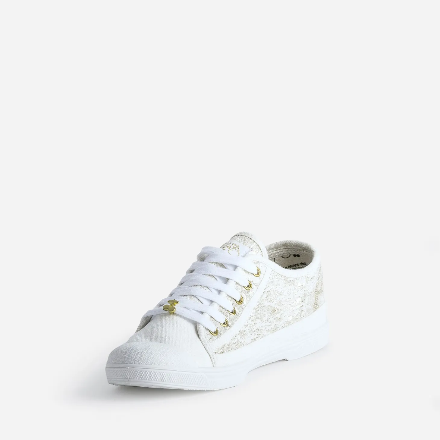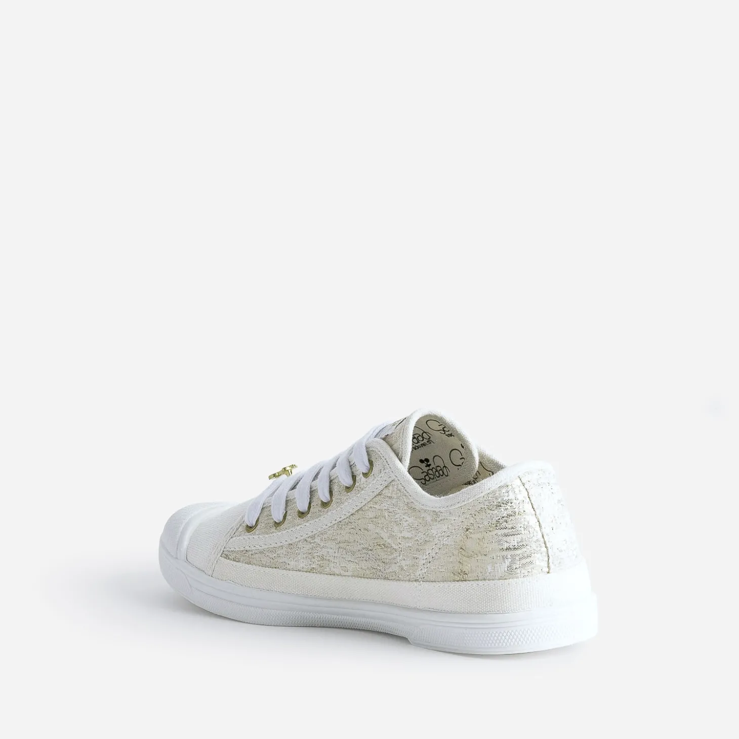 Cette tennis est un classique de la marque. En toile écrue, elle est rehaussée d’un empiècement en brocart doré, et est décorée d’un charm’ cerises identitaire en métal également doré glissé sur le lacet. La doublure intérieure accueille un marquage noir, la languette et le talon, une étiquette dorée. Une basket basse pour femme, qui affirme sa différence.