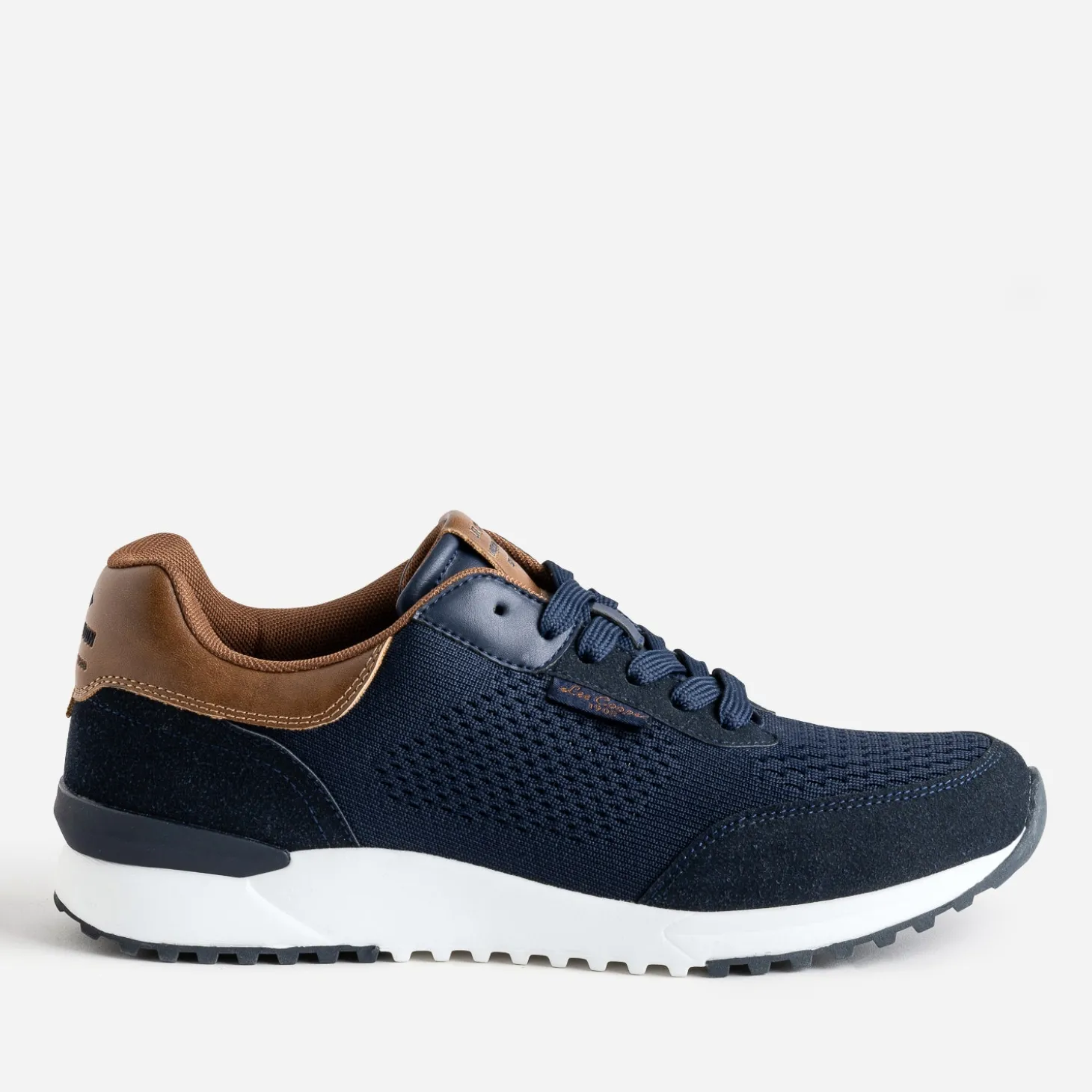 Mix matières alliant mesh tricoté et matière synthétique suédée bleu marine, cette tennis homme se laisse bousculer par des détails marron sur le contrefort, la tige et la languette. Un modèle à lacet, à réserver aux looks décontractés.