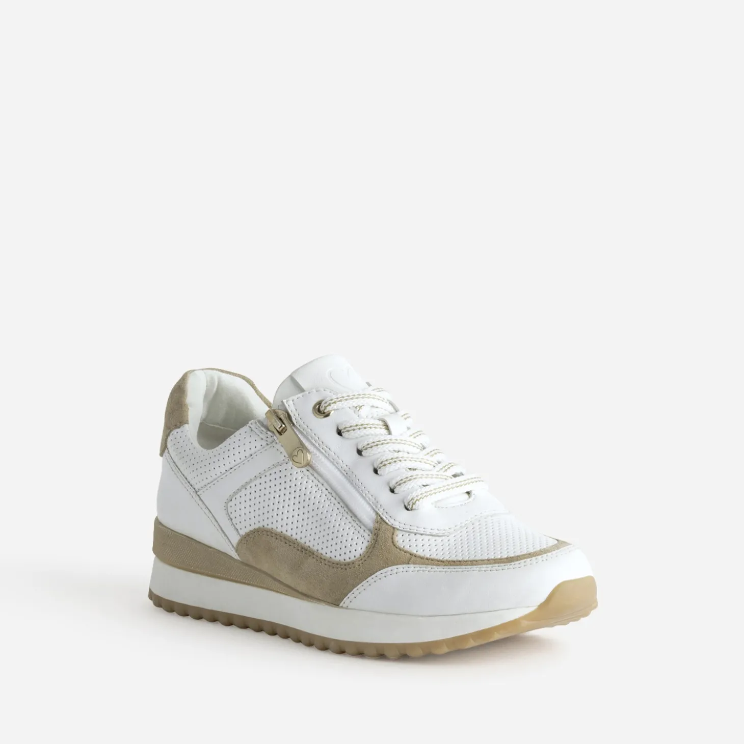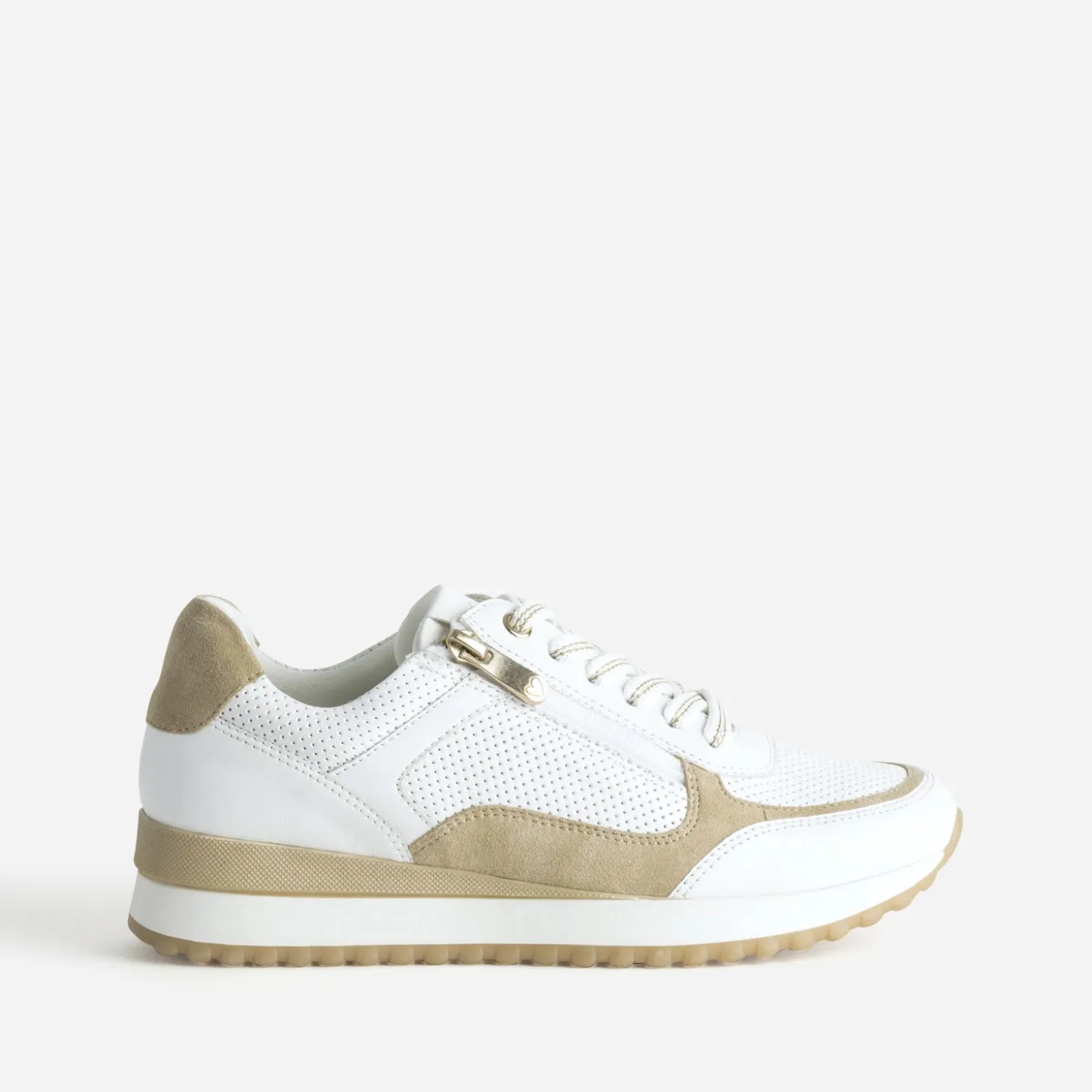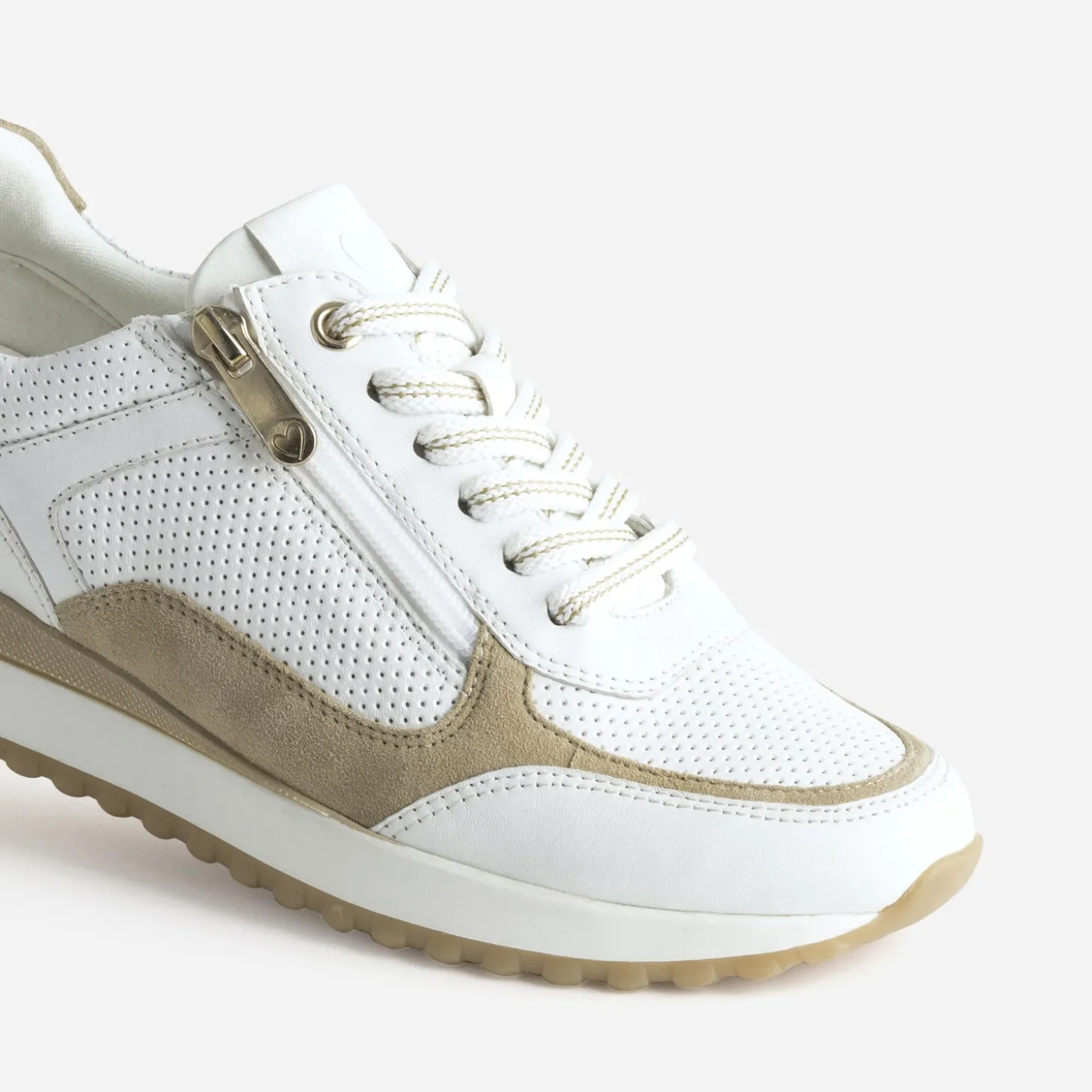 Blanc et beige côté couleurs. Cuir perforé et synthétique suédée côté matières. Cette tennis pour femme associe les contrastes, avec beaucoup de facilité. A l’intérieur, la semelle amovible permet de s’ajuster pour toujours plus de confort. Un modèle à imaginer avec une tunique en lin blanc et un pantalon chino beige, avec bords roulottés sur la cheville.