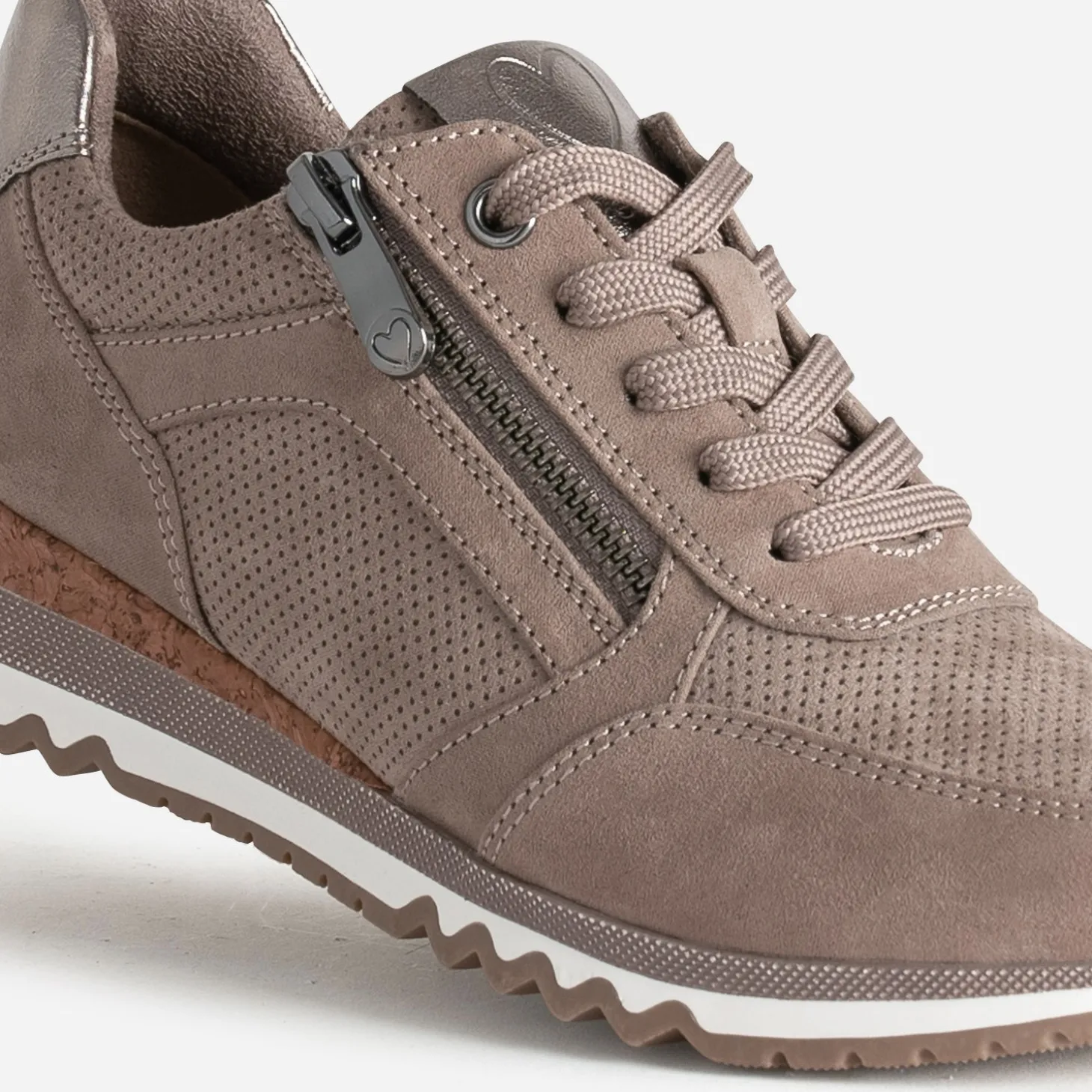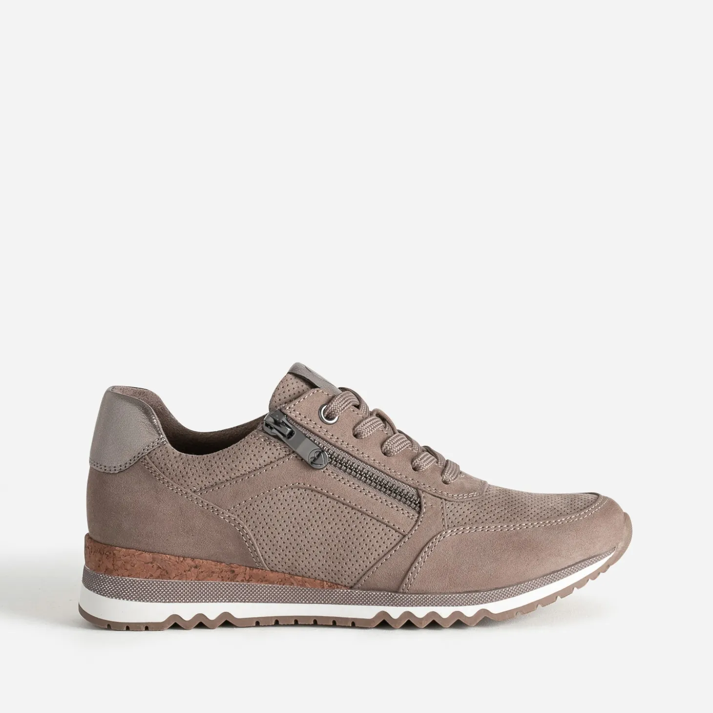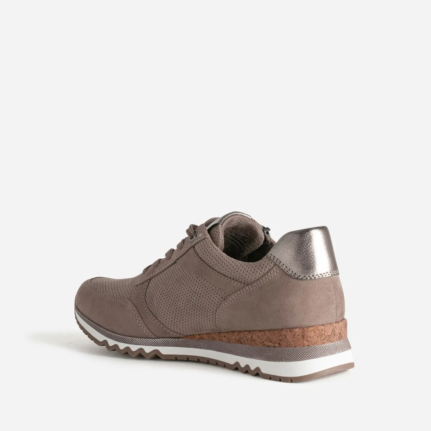 Cette tennis femme se décline en coloris taupe, idéale pour la mi-saison. Jeux de perforations, empiècements bronze métallisés sur la languette et le contrefort, apport de liège sur la semelle, les détails sont soignés. Montée sur une semelle sport crantée, elle présente une semelle première amovible et promet un confort inégalé.