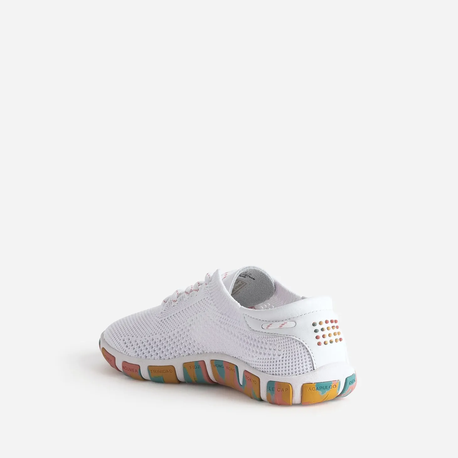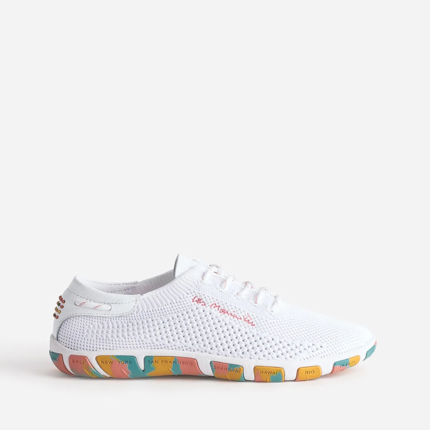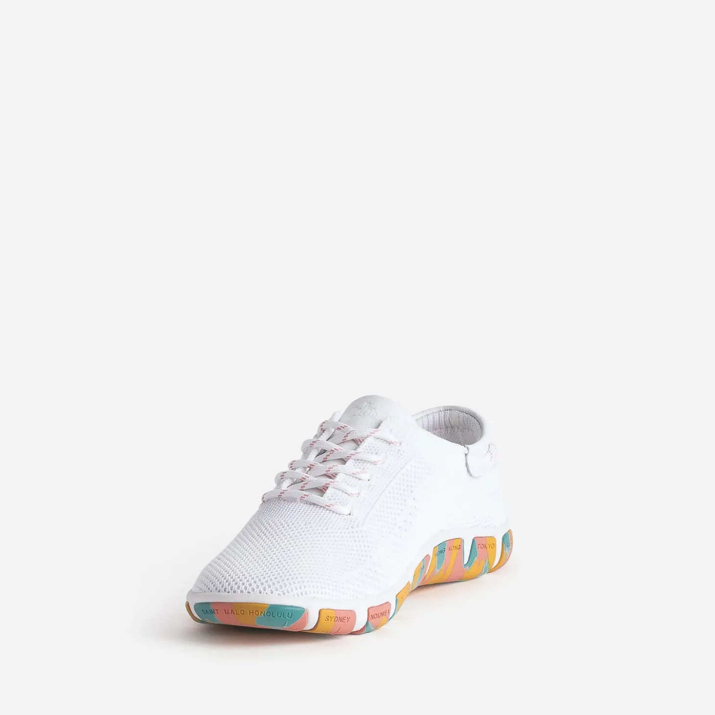 Signé ‘Les Marinières’, cet iconique de la marque, conçu en textile tricoté, inspiré du mesh des équipements de sport et non doublé, est reconnu pour sa légèreté, sa souplesse et sa résistance. Adoptez, sans attendre, cette tennis pour femme en coloris blanc, avec lacet rond délicatement rayé de corail, en écho à la broderie placée sur le côté. La semelle contrastée se démarque par un motif camouflage coloré. New York, Hawaï, Saint Malo ou Hong Kong, voyagez le pied léger !