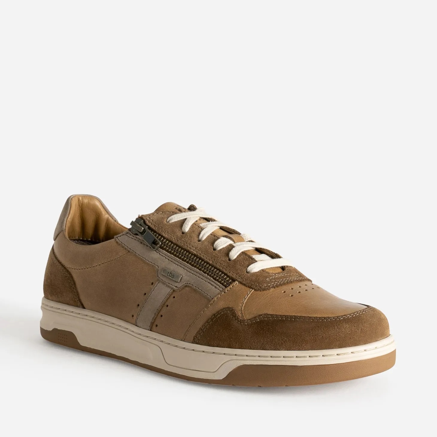 Des couleurs sobres et élégants, autour d’un camaïeu de camel, de beige et de marron. Des mélanges de cuir lisse et cuir velours. Une fermeture par lacet, avec zip côté. Cette tennis chausse les hommes en quête de style et de confort ; un confort renforcé par une semelle intérieure amovible. Un modèle tendance à jouer avec un look décontracté.