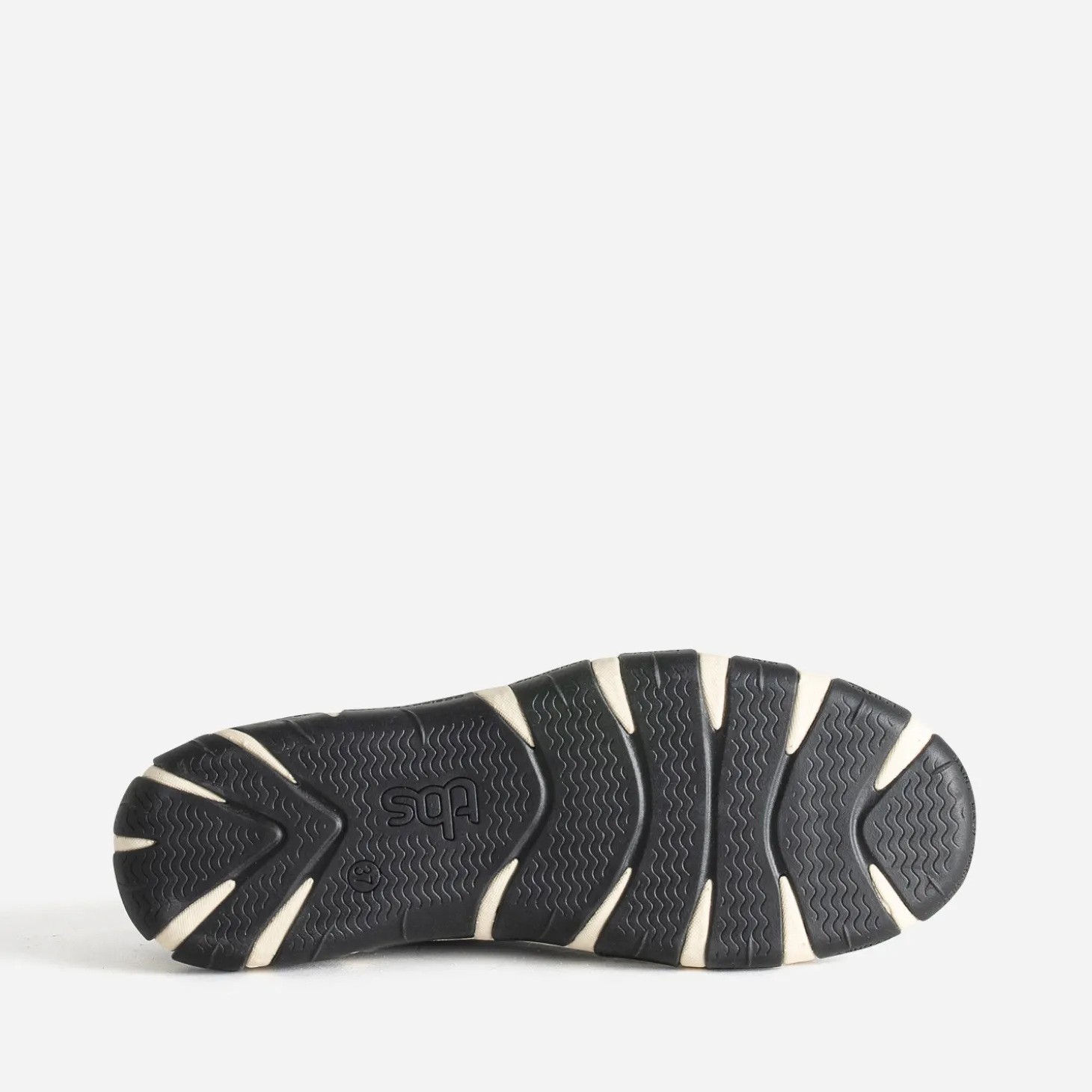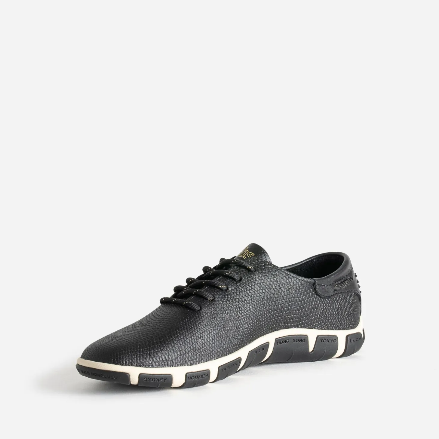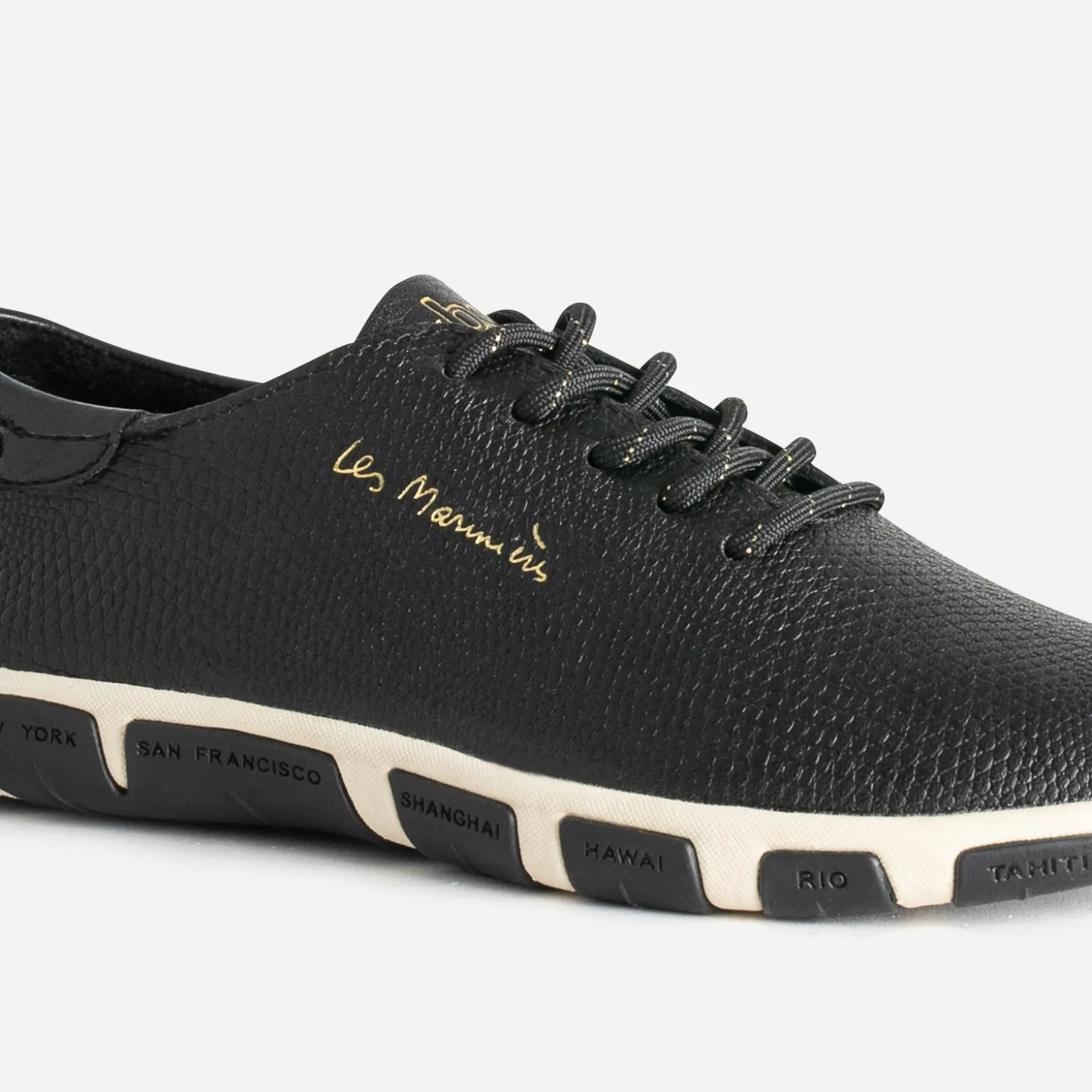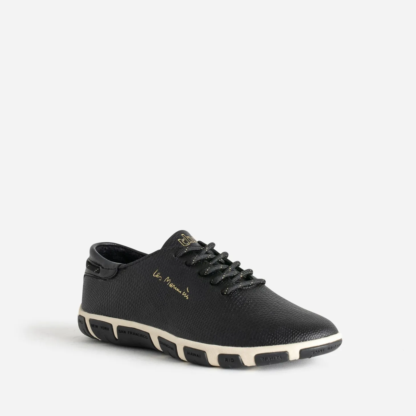 Adoptez, sans attendre, cette tennis pour femme en coloris noir, avec lacet rond délicatement rayé et semelle contrastée. Signé ‘Les Marinières’, cet iconique de la marque conçu entièrement en cuir non doublé, avec embossage effet python, est reconnu pour sa légèreté, sa souplesse et sa résistance. New York, Hawaï, Saint Malo ou Hong Kong, voyagez le pied léger !