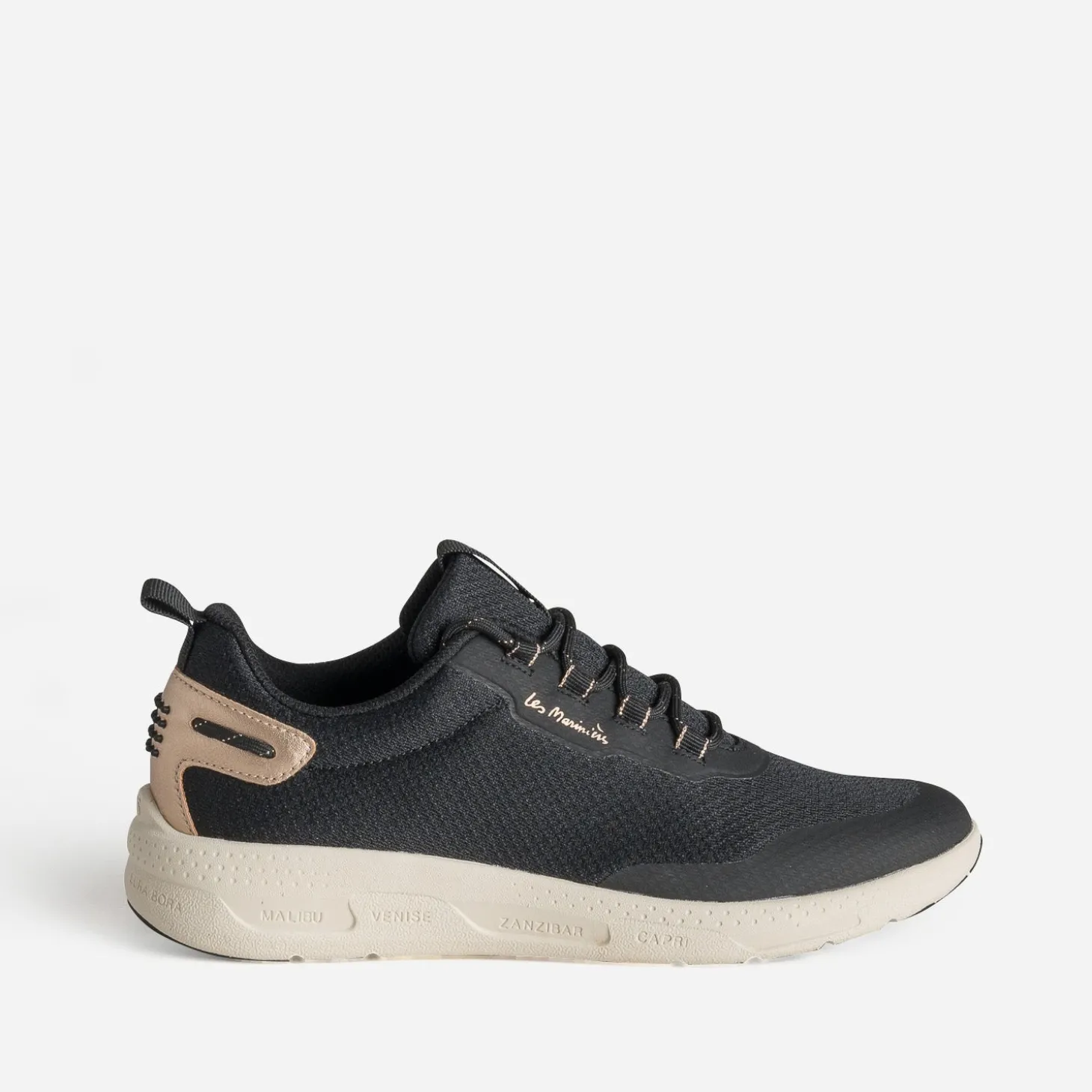 ‘Les Marinières’, c’est une ligne de tennis iconiques, signées, sur la semelle, de noms de villes situées en bord de mer comme Venise, Zanzibar ou Séville. Elle doit sa légèreté (moins de 400 grammes) à sa conception en mesh. Noire, elle est rehaussée de détails cuivrés sur le lacet et le contrefort. La semelle intérieure est amovible, pour être, si besoin, remplacée par une version plus adaptée. Un modèle au design sportswear, idéal pour de longues balades.