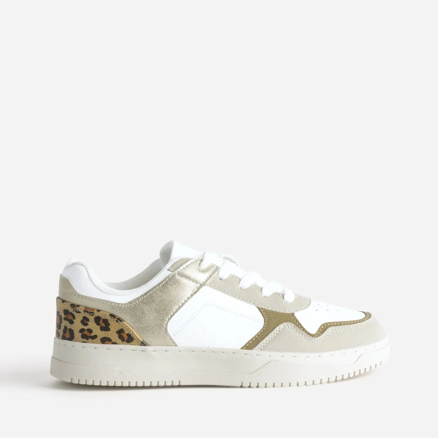 La tennis s’est élevée au rang de chaussure star, depuis plusieurs saisons. Confectionnée en matières synthétiques lisses et veloutées, elle associe le blanc, le beige et le marron, à des touches de doré sur les côtés, et à un empiècement à motif léopard sur le contrefort. Elle est montée sur une semelle contrastée beige clair, et se ferme par lacet. Un modèle au design dans l’air du temps, à jouer avec une tenue décontractée : tee-shirt blanc, jean bleu, ceinture à motif léopard.